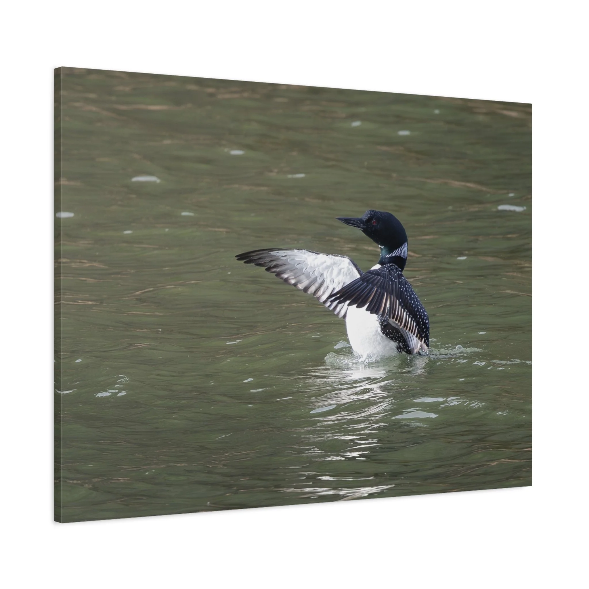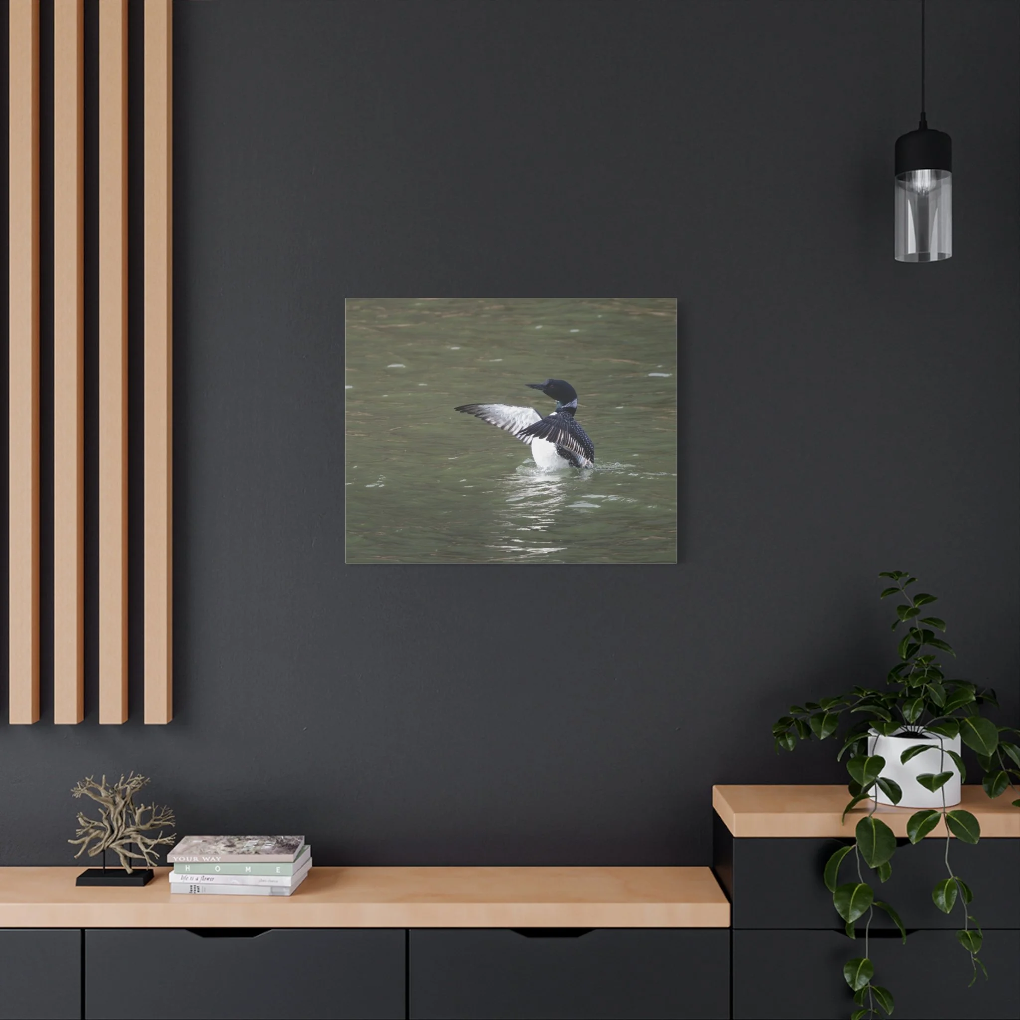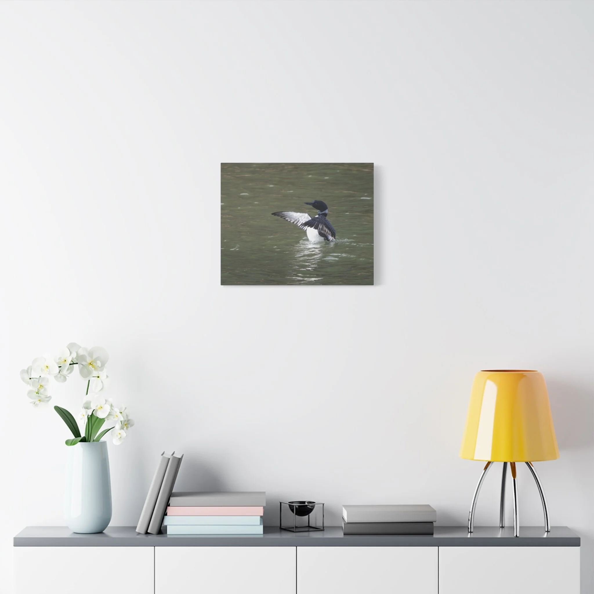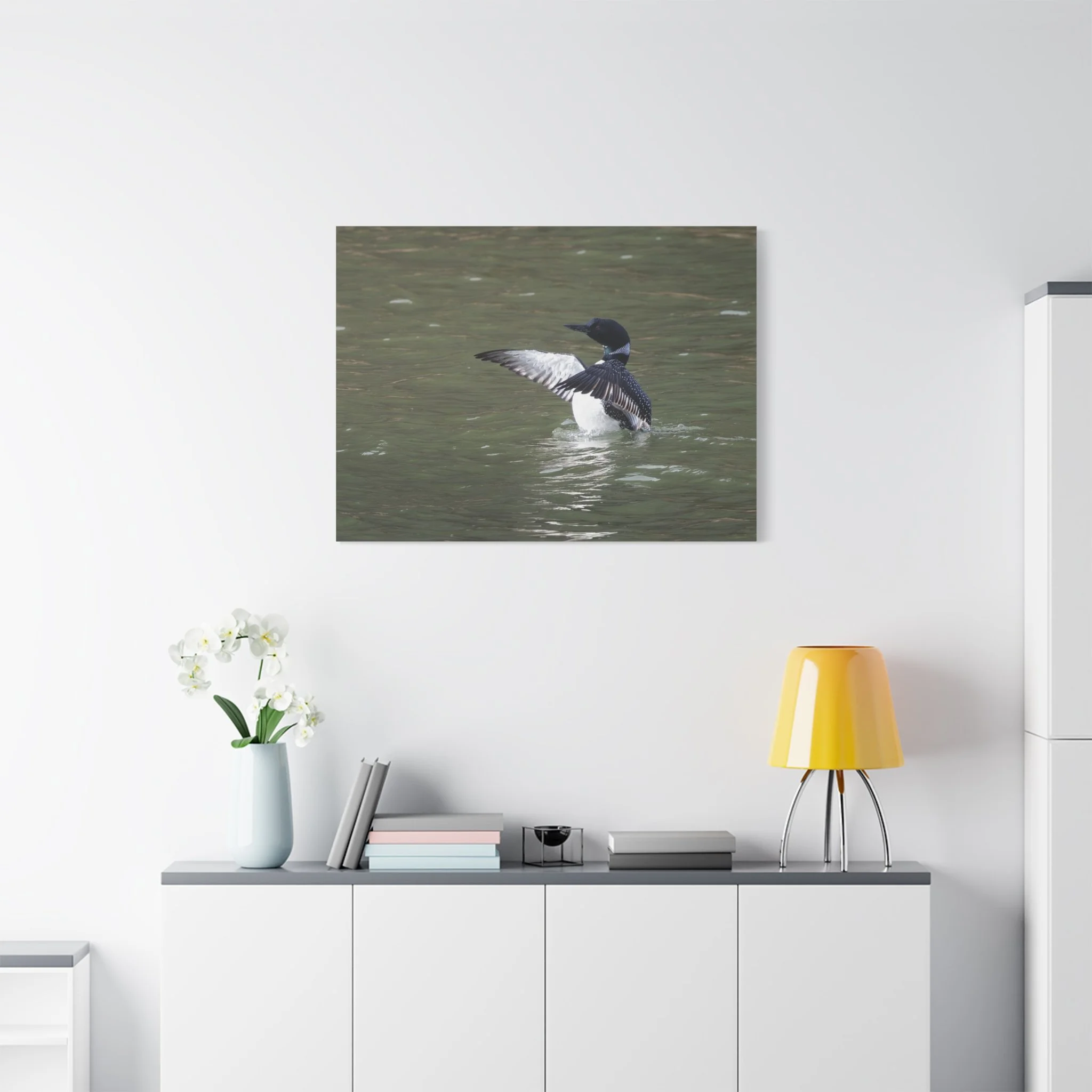 A stretched matte canvas that captures a common loon. The muted, satin-matte finish reduces glare and lets the bird’s silhouette and subtle feather textures speak softly across the room. Light and earthy tones settle into the cotton-poly canvas for a natural look that feels like a lake-side memory. Hung on a slim 1.25" pine frame, the piece brings calm and a gentle focal point to living rooms, dens, or cabins where mornings begin with mist and water. Rubber pads on the back keep the print steady on the wall, and the included hanging hardware makes placement easy. Available in multiple orientations and sizes to suit a lakeside nook or a large feature wall.