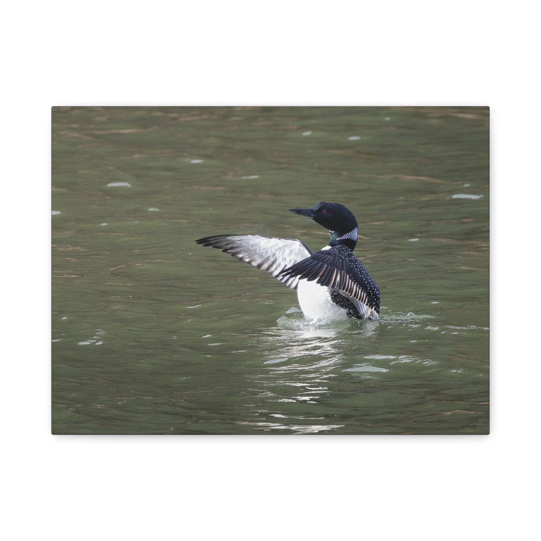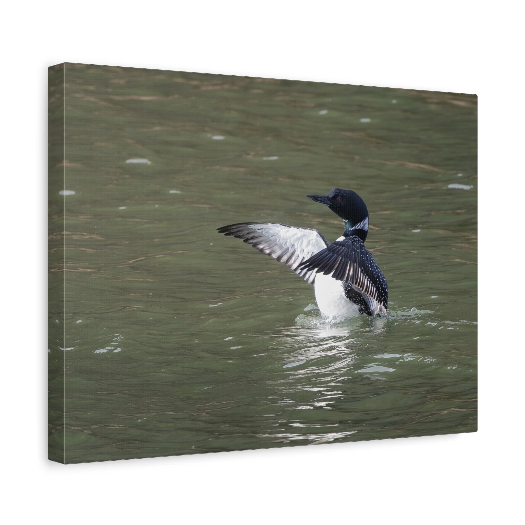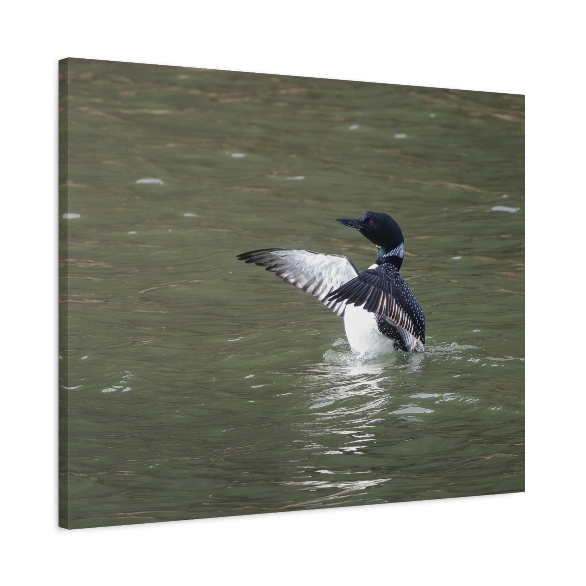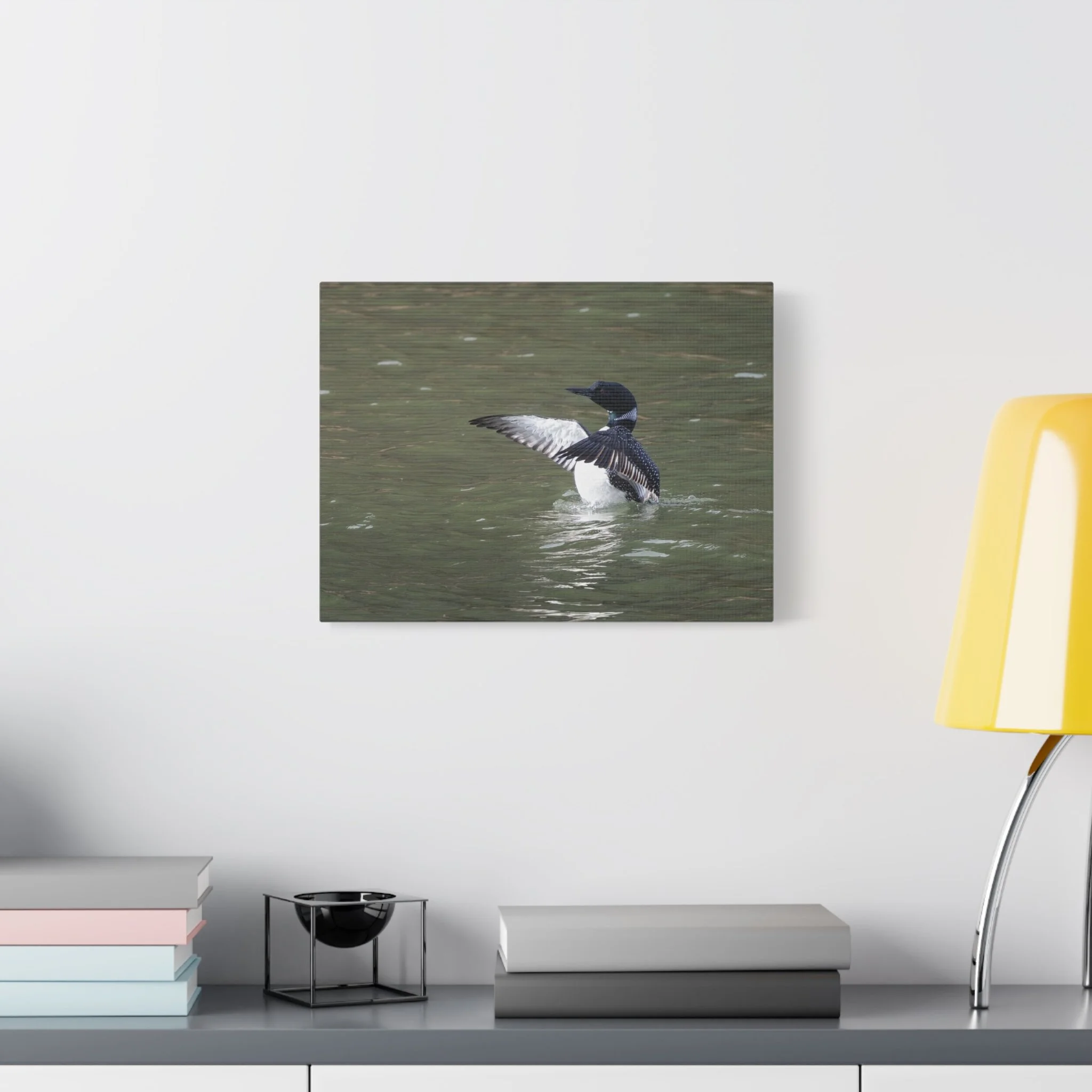 A stretched matte canvas that captures a common loon. The muted, satin-matte finish reduces glare and lets the bird’s silhouette and subtle feather textures speak softly across the room. Light and earthy tones settle into the cotton-poly canvas for a natural look that feels like a lake-side memory. Hung on a slim 1.25" pine frame, the piece brings calm and a gentle focal point to living rooms, dens, or cabins where mornings begin with mist and water. Rubber pads on the back keep the print steady on the wall, and the included hanging hardware makes placement easy. Available in multiple orientations and sizes to suit a lakeside nook or a large feature wall.