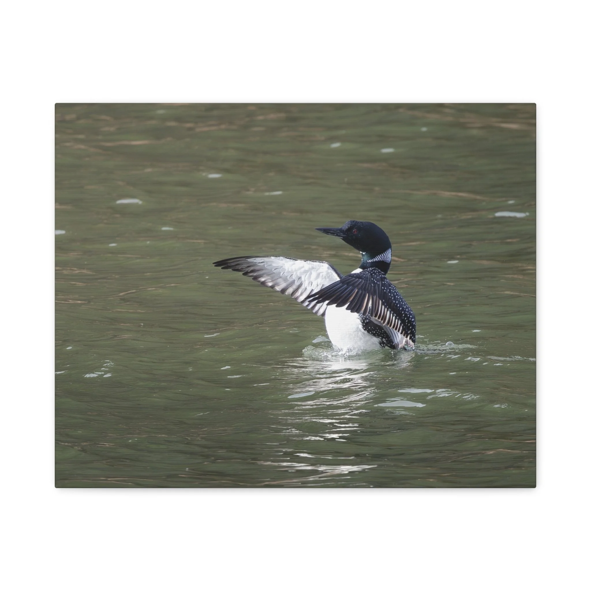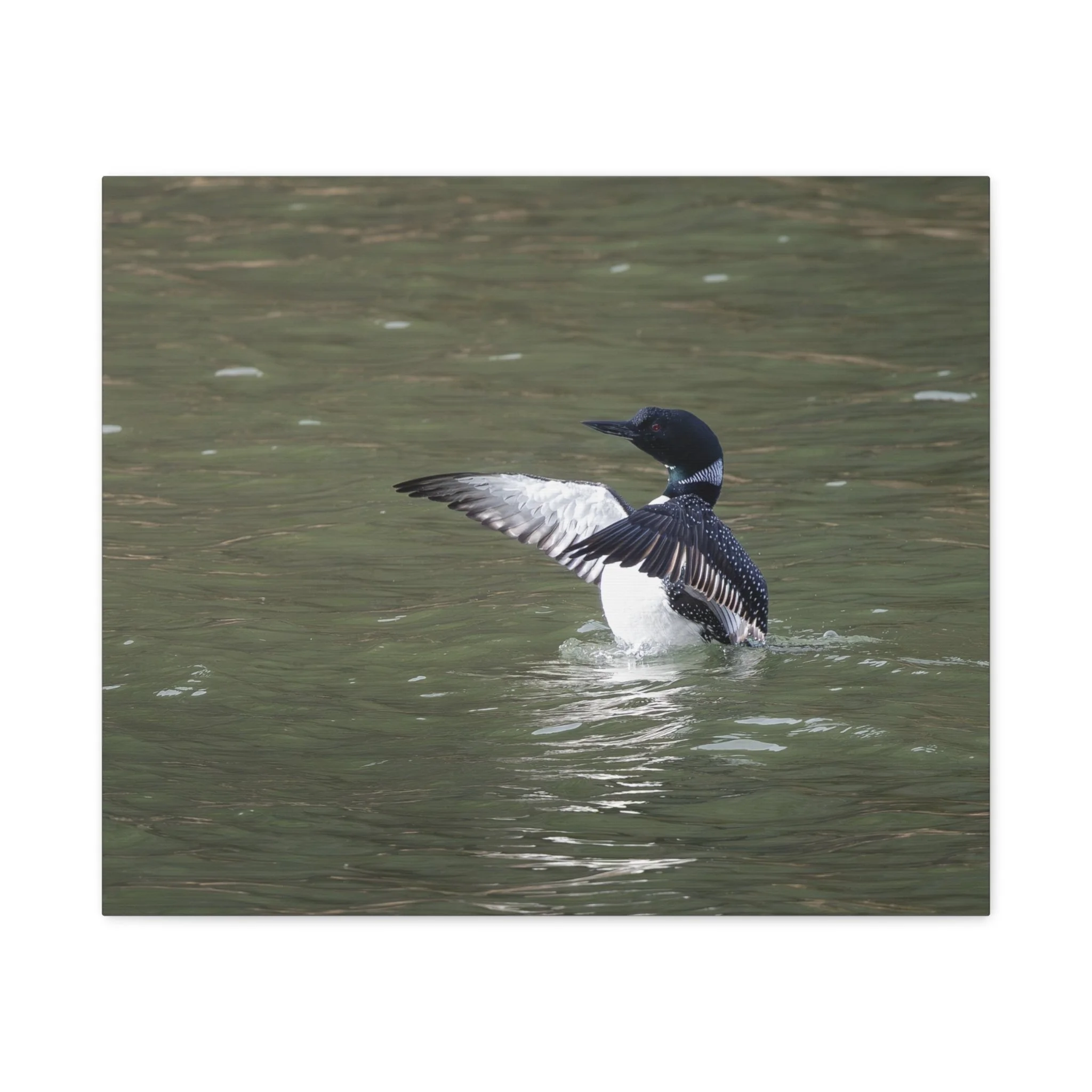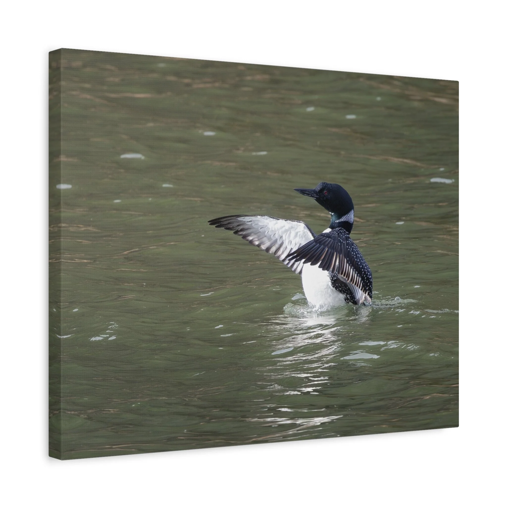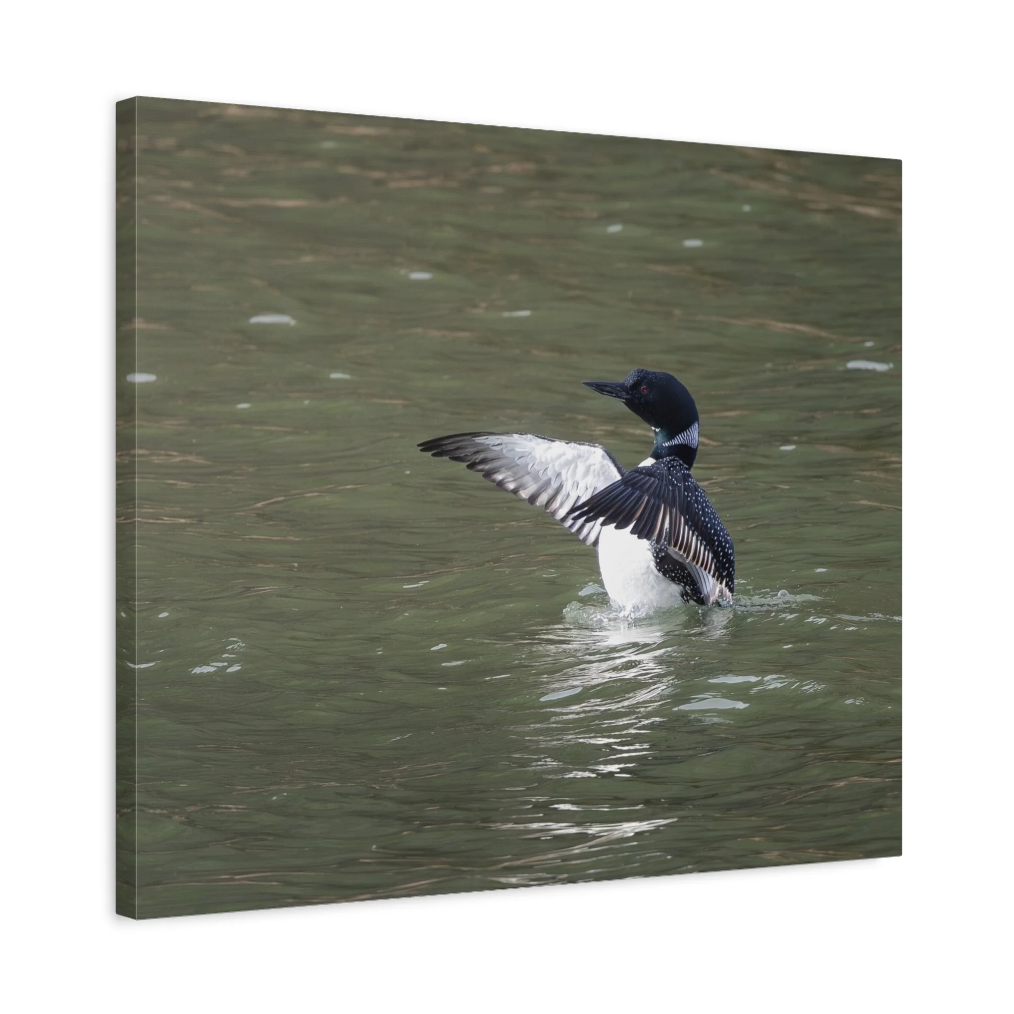 A stretched matte canvas that captures a common loon. The muted, satin-matte finish reduces glare and lets the bird’s silhouette and subtle feather textures speak softly across the room. Light and earthy tones settle into the cotton-poly canvas for a natural look that feels like a lake-side memory. Hung on a slim 1.25" pine frame, the piece brings calm and a gentle focal point to living rooms, dens, or cabins where mornings begin with mist and water. Rubber pads on the back keep the print steady on the wall, and the included hanging hardware makes placement easy. Available in multiple orientations and sizes to suit a lakeside nook or a large feature wall.