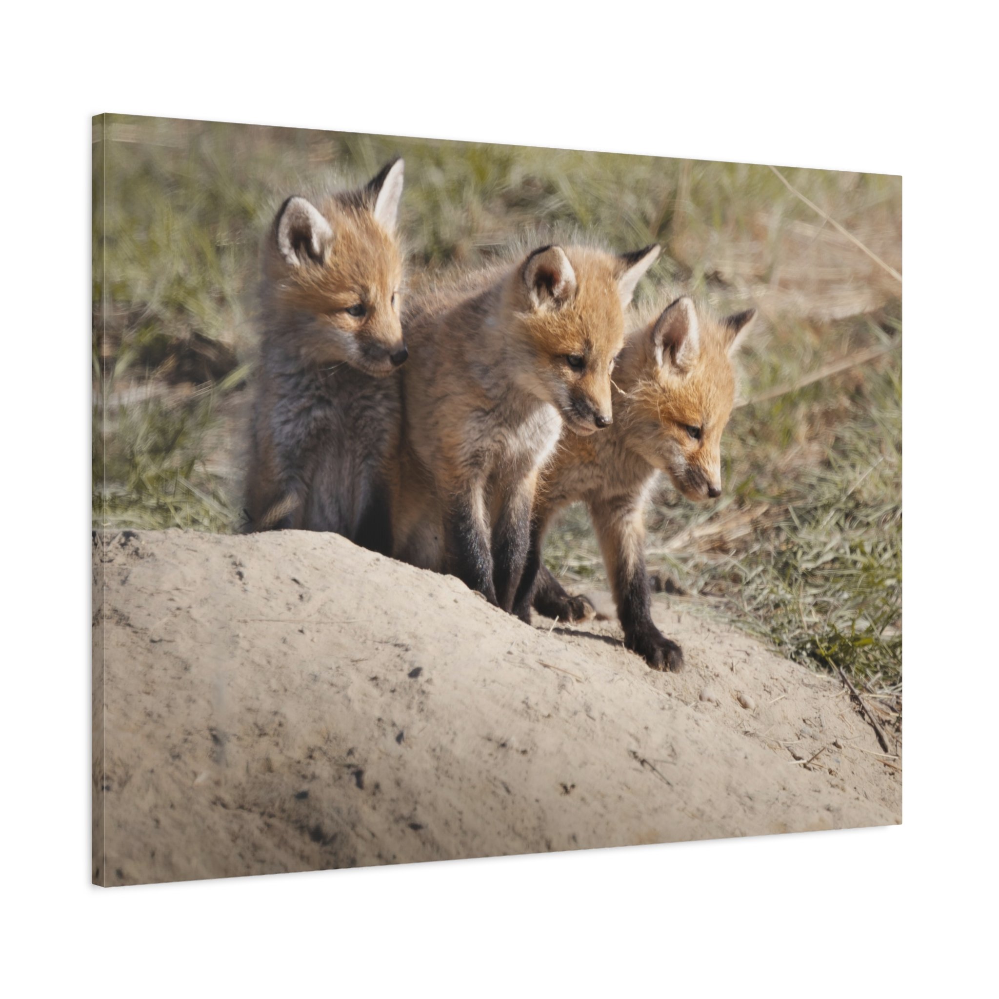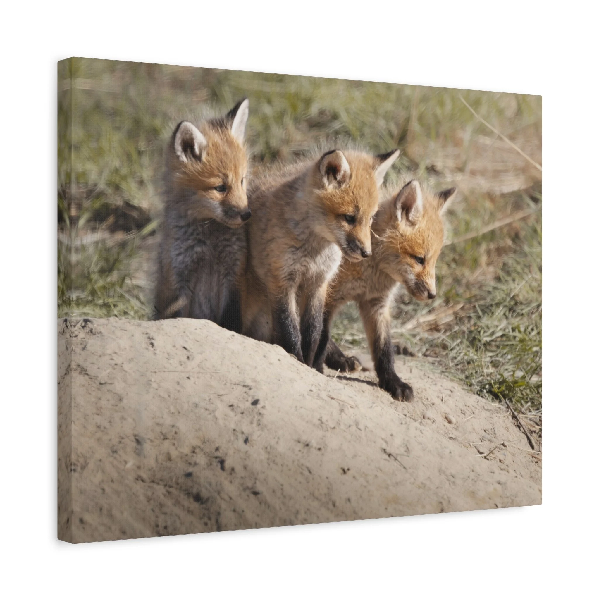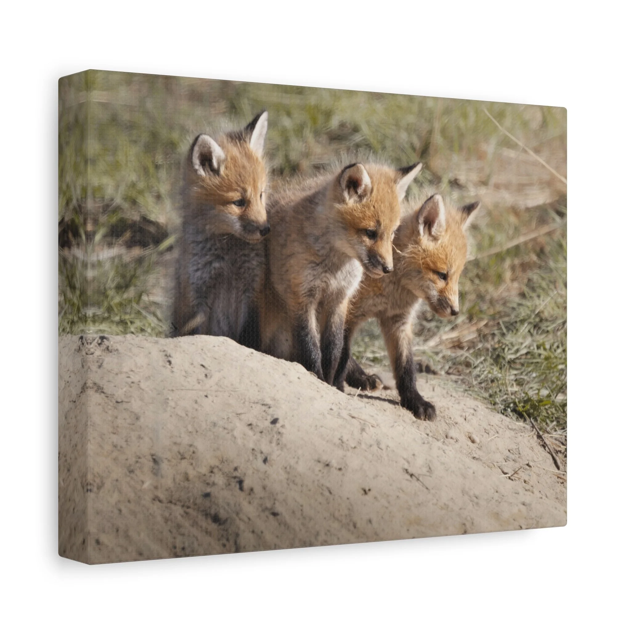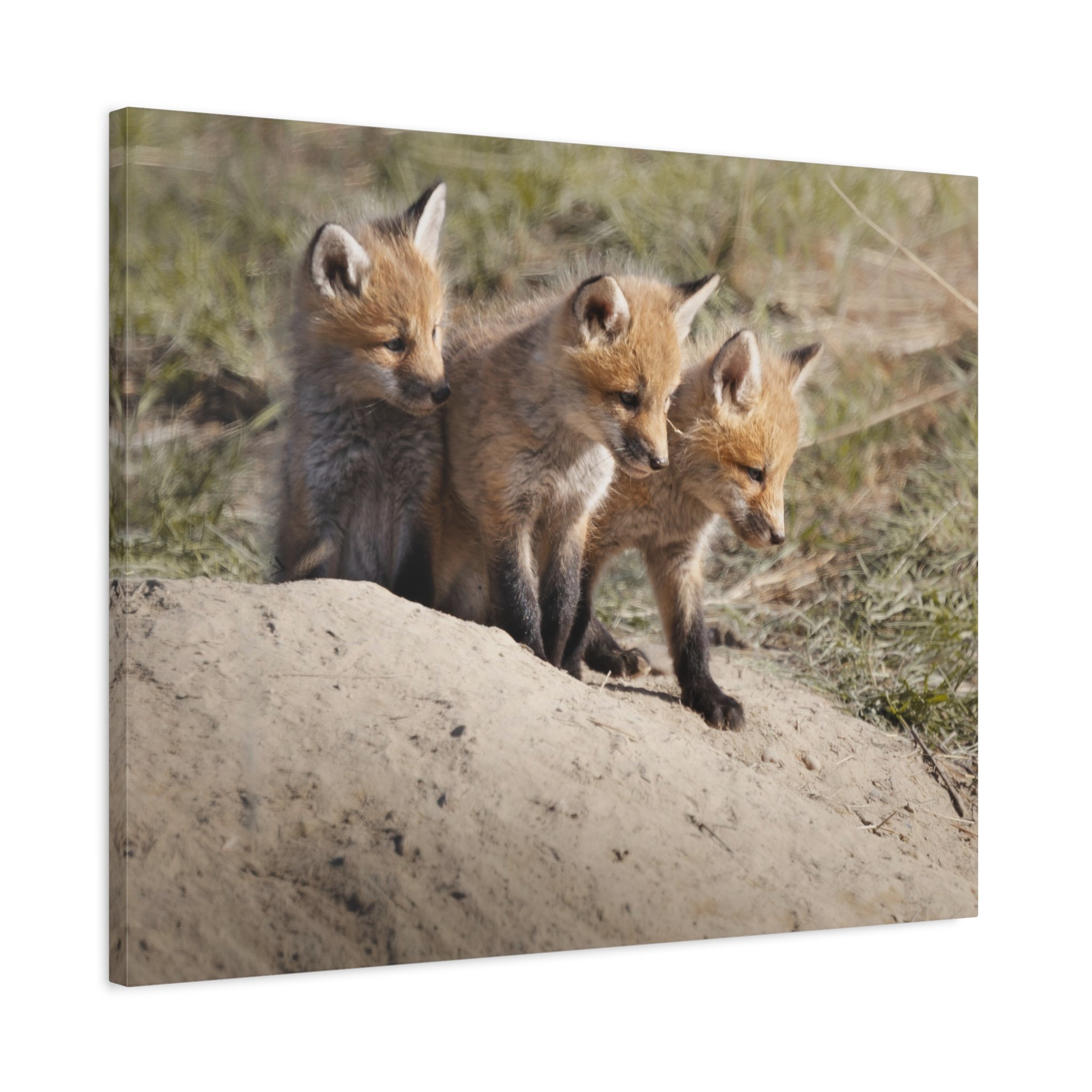 Three fox kits, heads tilted and eyes bright, captured on matte canvas with painterly warmth. This stretched canvas brings a quiet, curious moment of woodland life into living rooms, nurseries, or reading nooks. The soft, natural tones and subtle texture of the canvas make the foxes feel close—like a gently observed scene from a forest edge at dawn. Hung above a mantel or leaned on a shelf, the print adds a calm, story-filled presence that invites slow looks and conversations about nature and wonder.