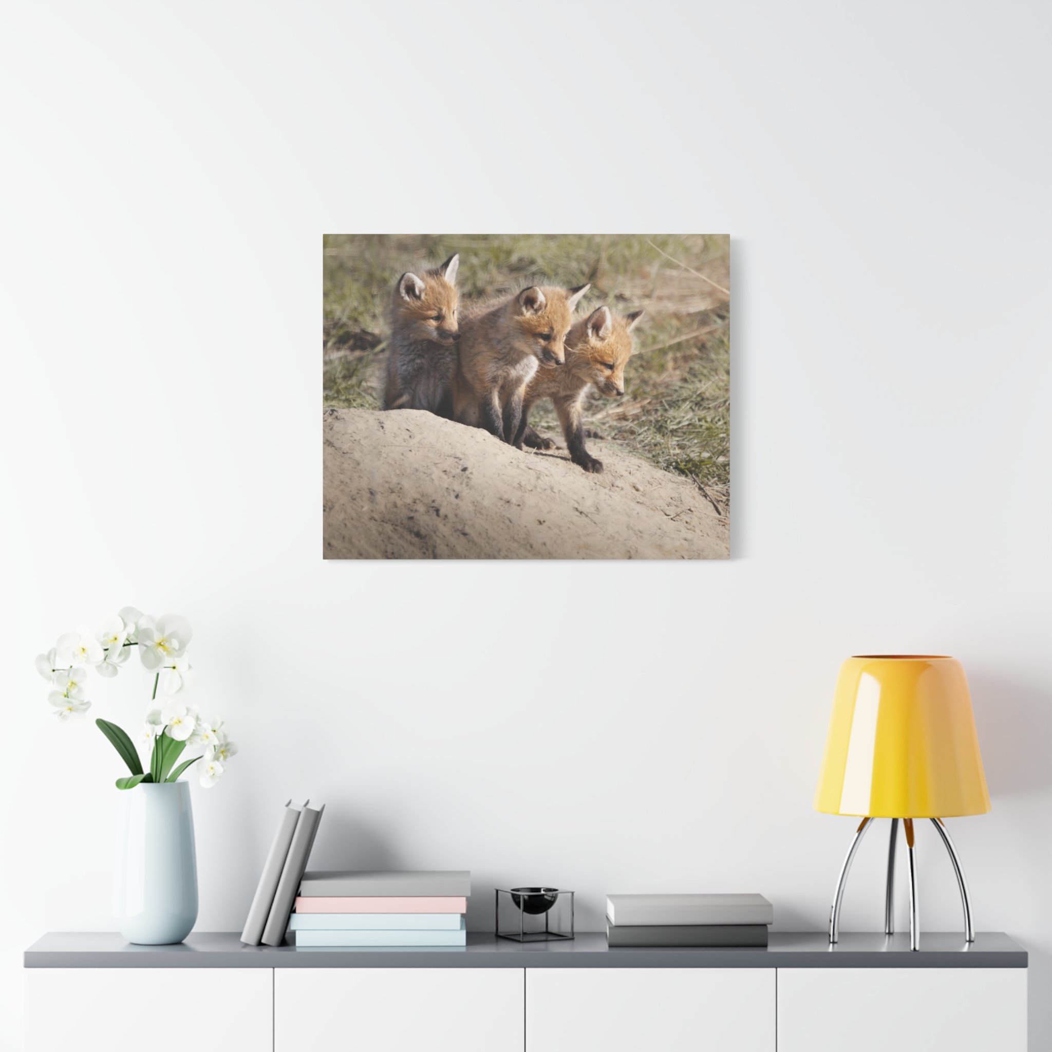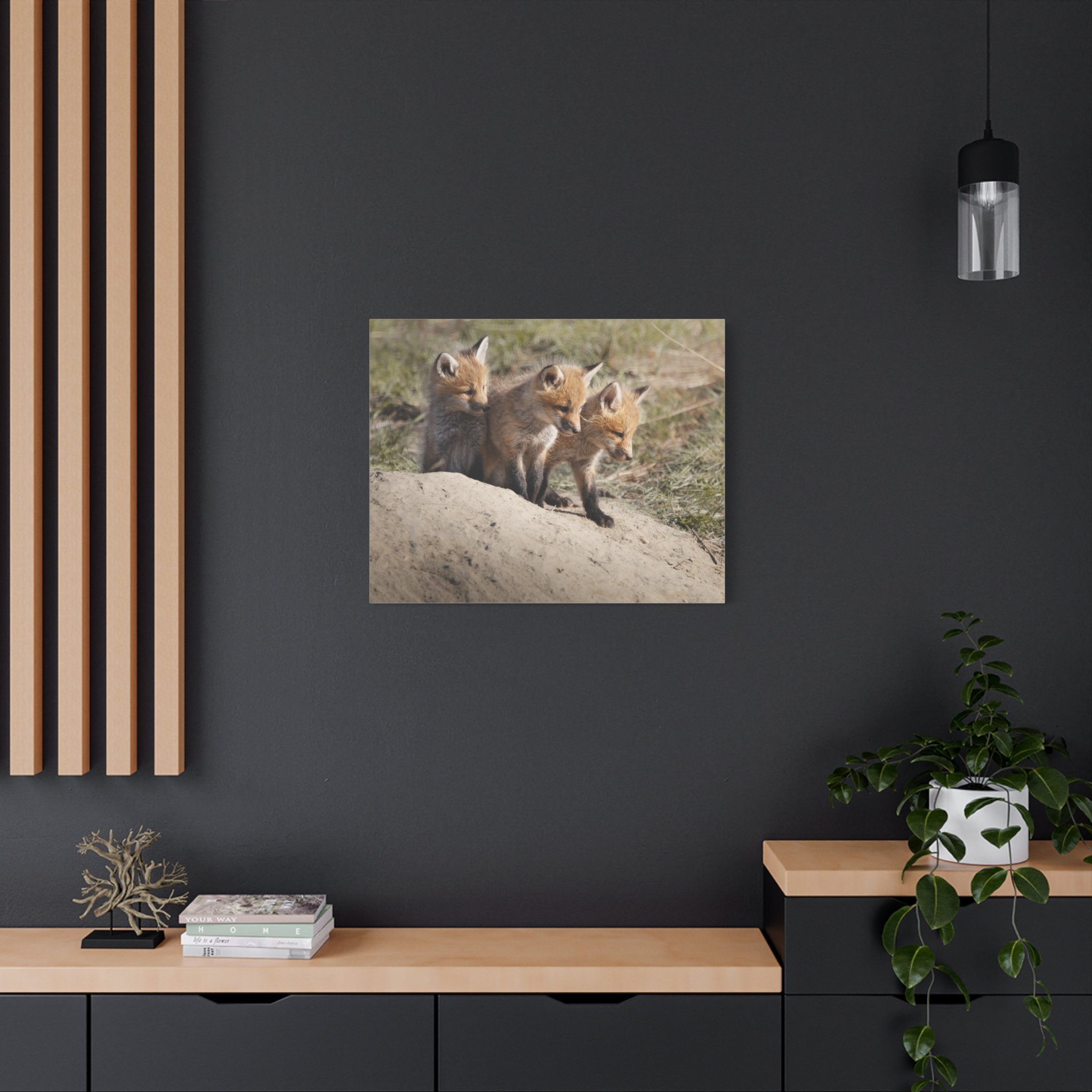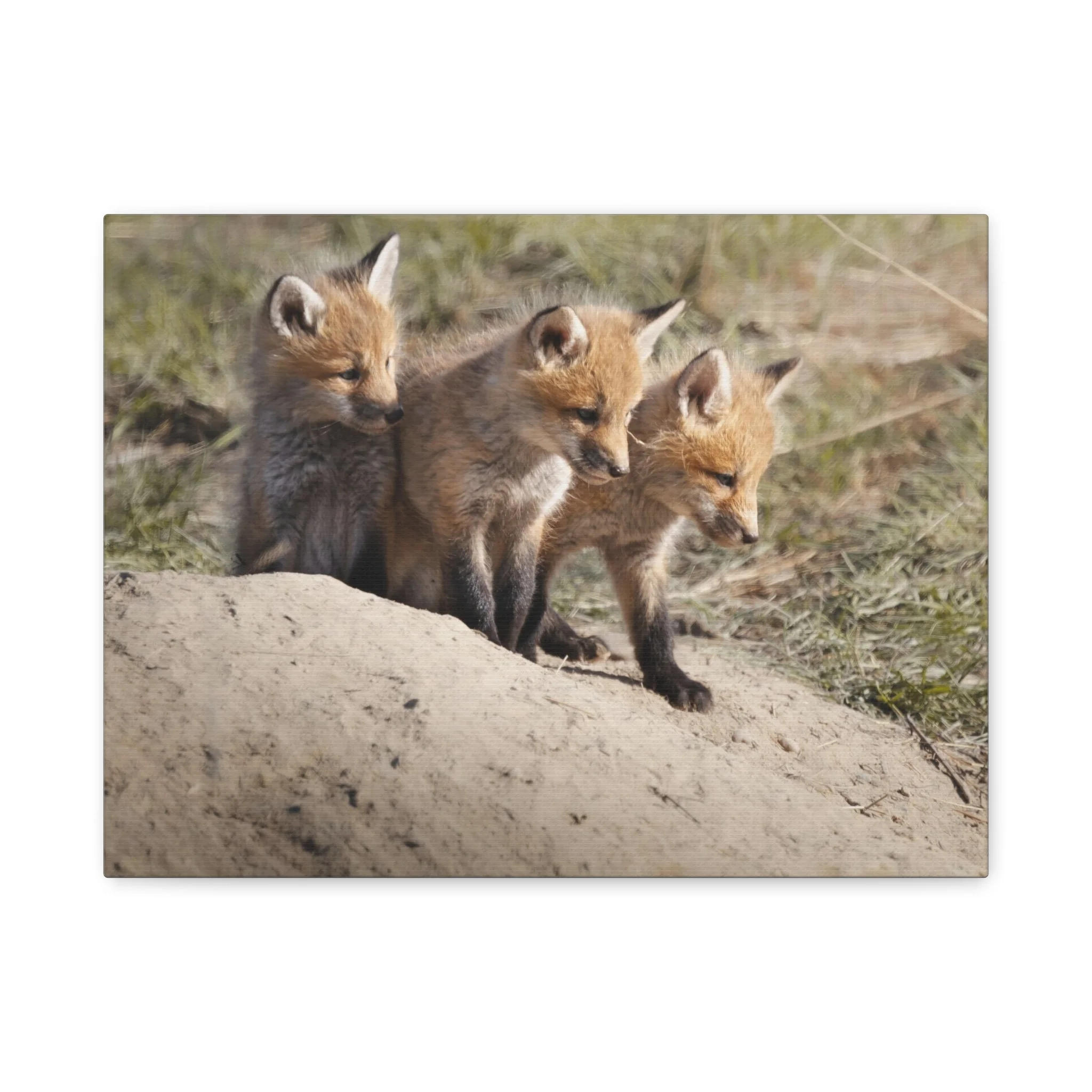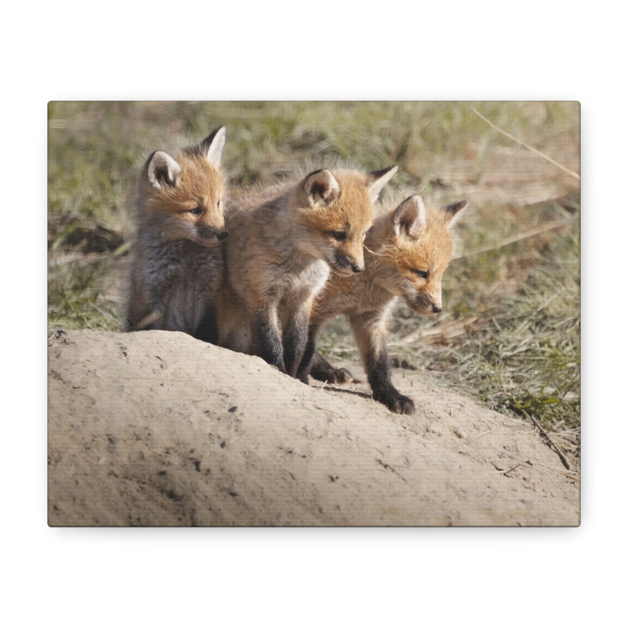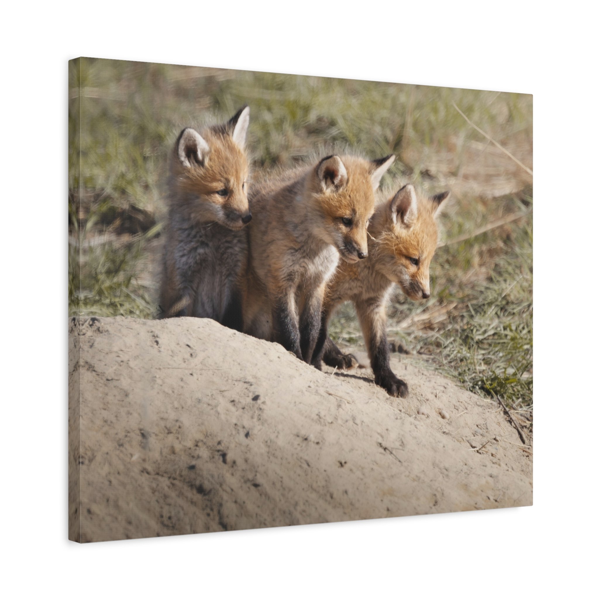 Three fox kits, heads tilted and eyes bright, captured on matte canvas with painterly warmth. This stretched canvas brings a quiet, curious moment of woodland life into living rooms, nurseries, or reading nooks. The soft, natural tones and subtle texture of the canvas make the foxes feel close—like a gently observed scene from a forest edge at dawn. Hung above a mantel or leaned on a shelf, the print adds a calm, story-filled presence that invites slow looks and conversations about nature and wonder.