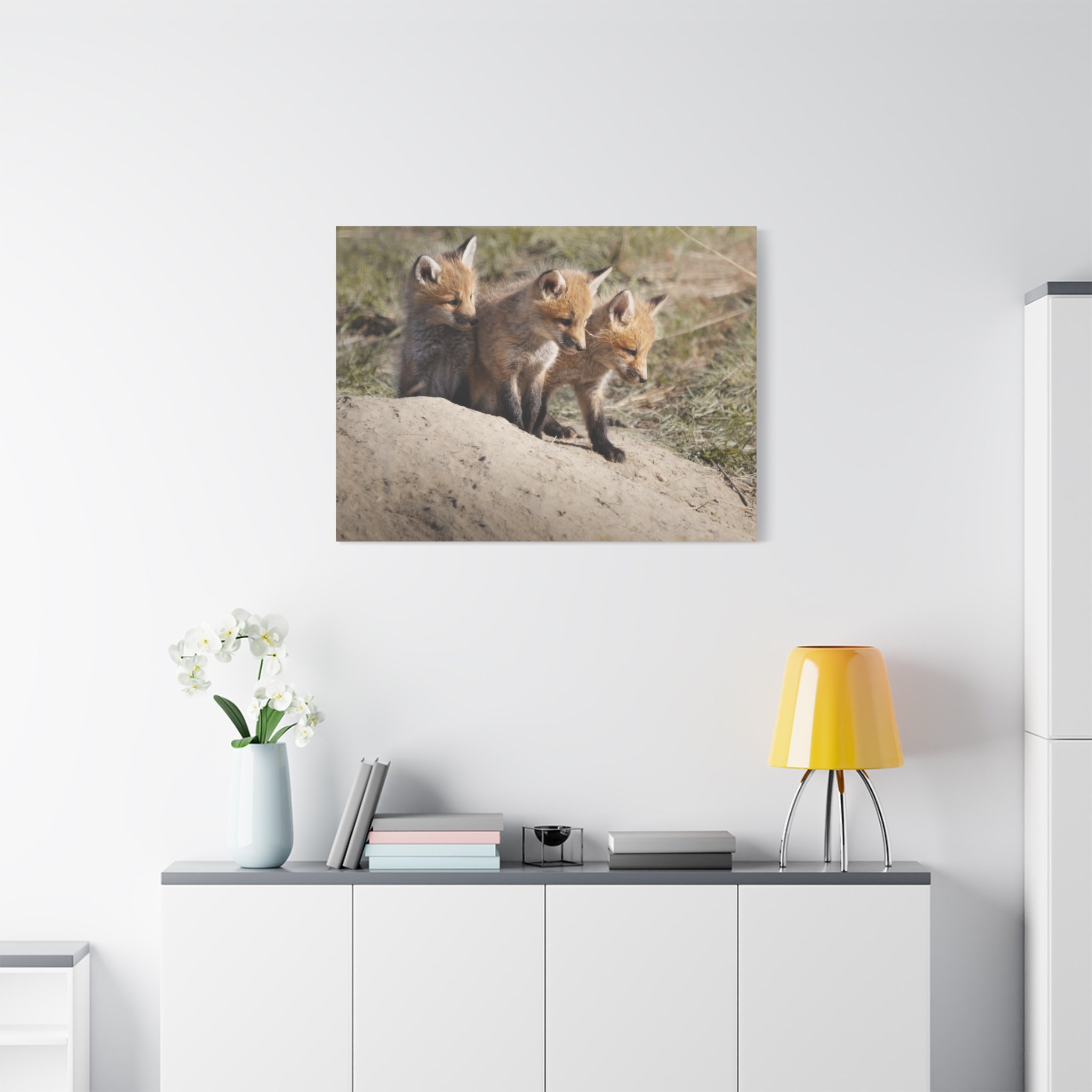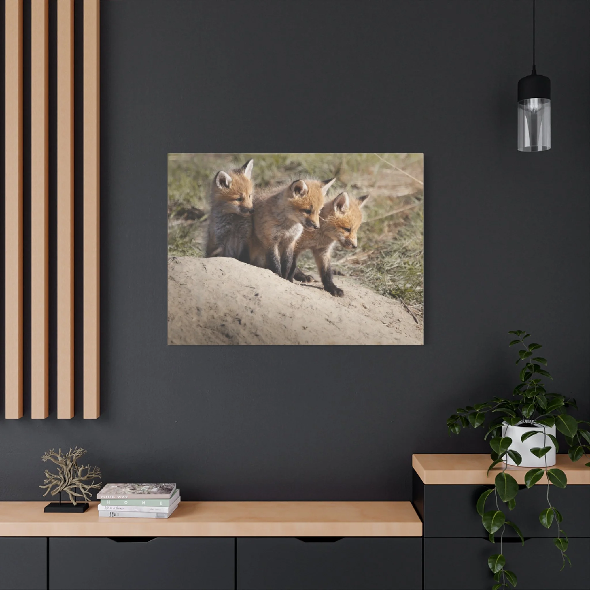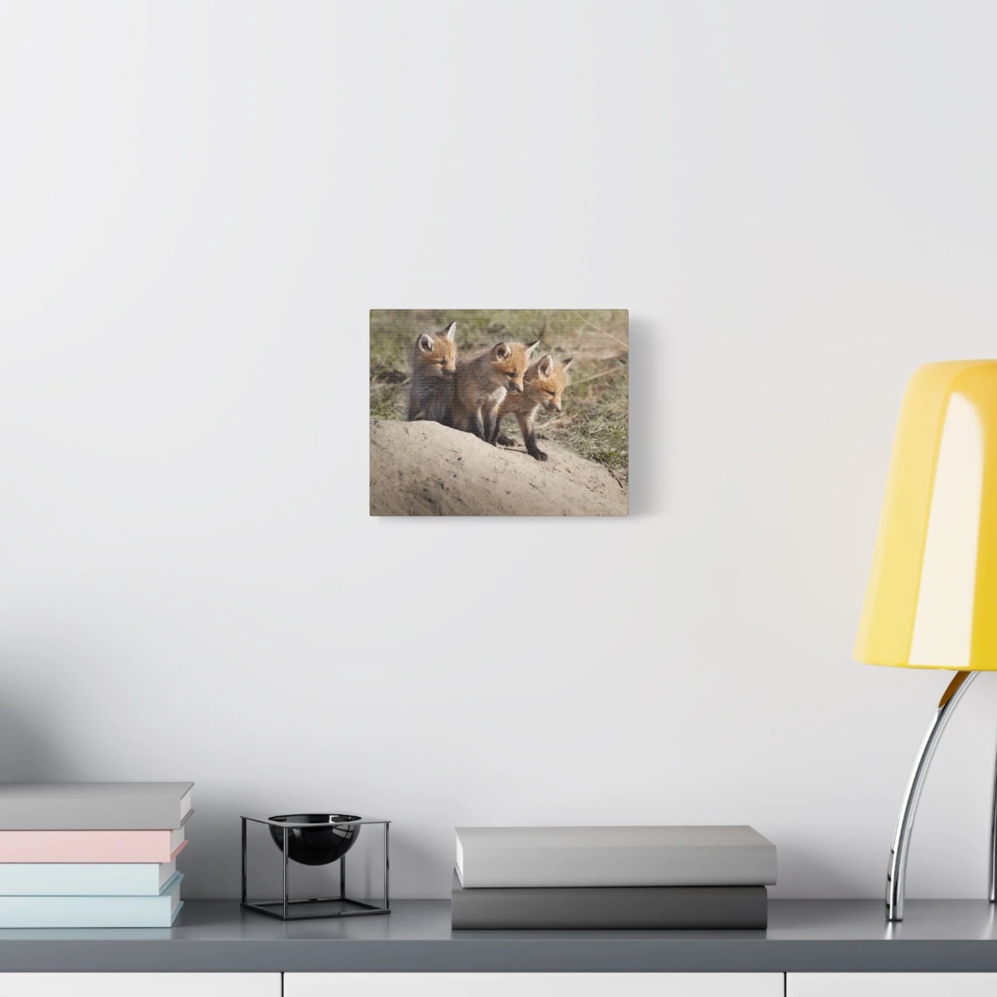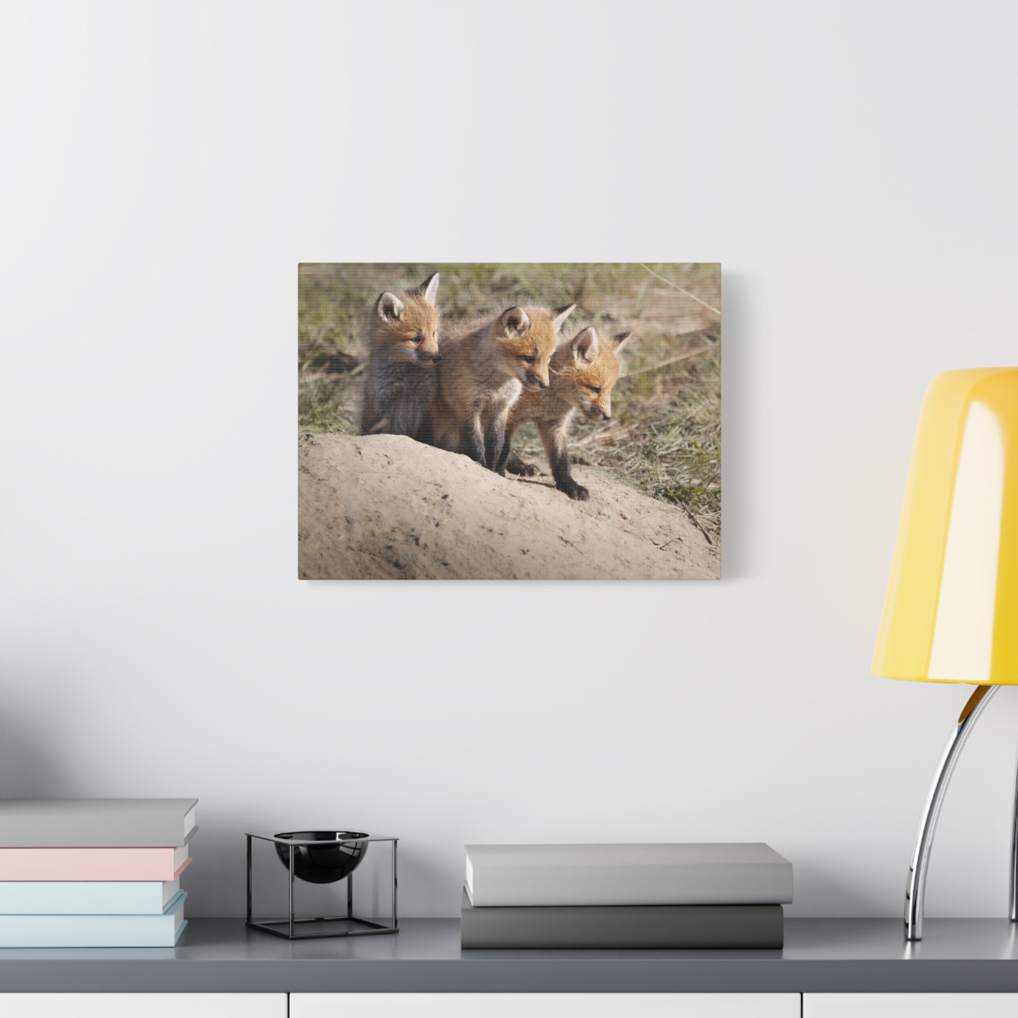 Three fox kits, heads tilted and eyes bright, captured on matte canvas with painterly warmth. This stretched canvas brings a quiet, curious moment of woodland life into living rooms, nurseries, or reading nooks. The soft, natural tones and subtle texture of the canvas make the foxes feel close—like a gently observed scene from a forest edge at dawn. Hung above a mantel or leaned on a shelf, the print adds a calm, story-filled presence that invites slow looks and conversations about nature and wonder.