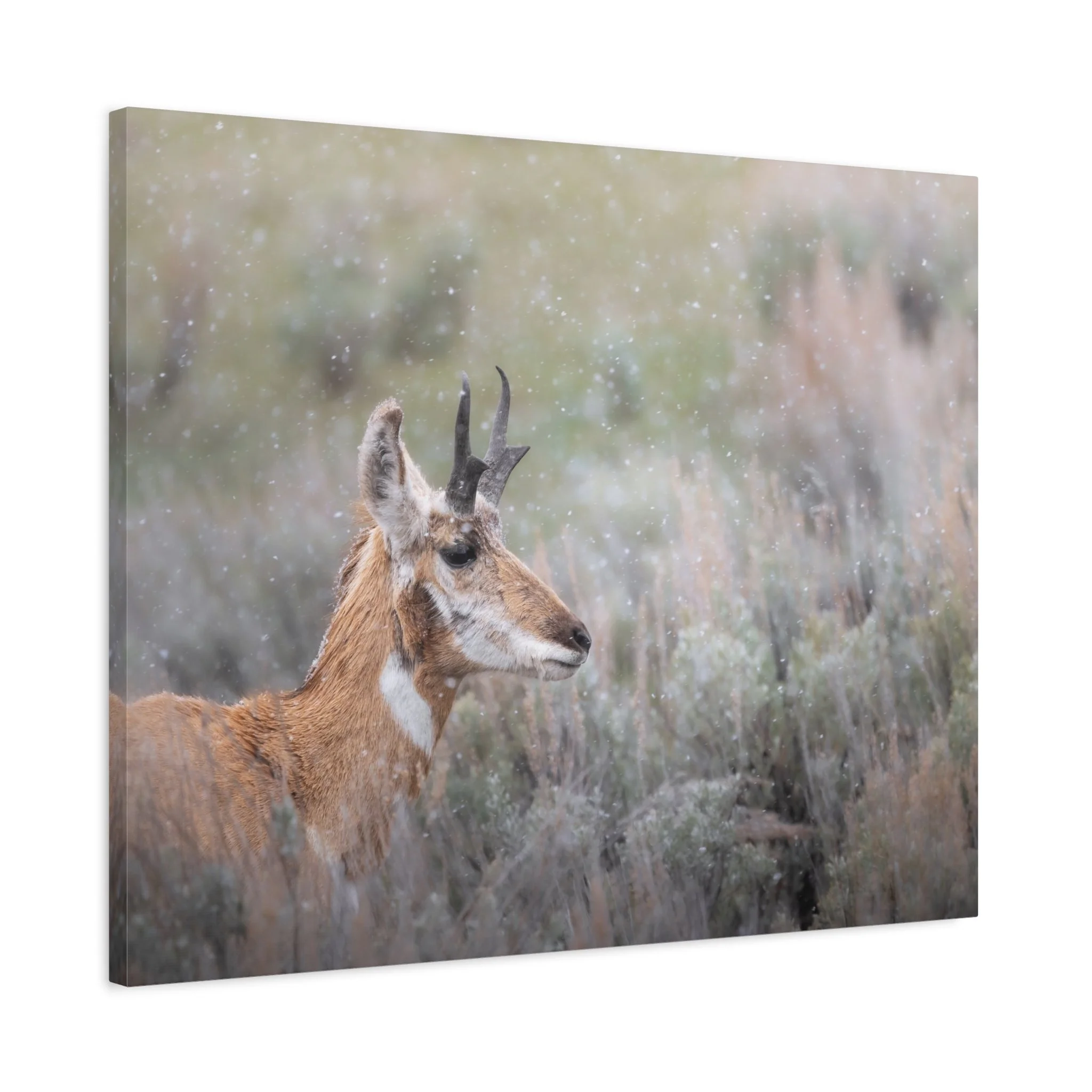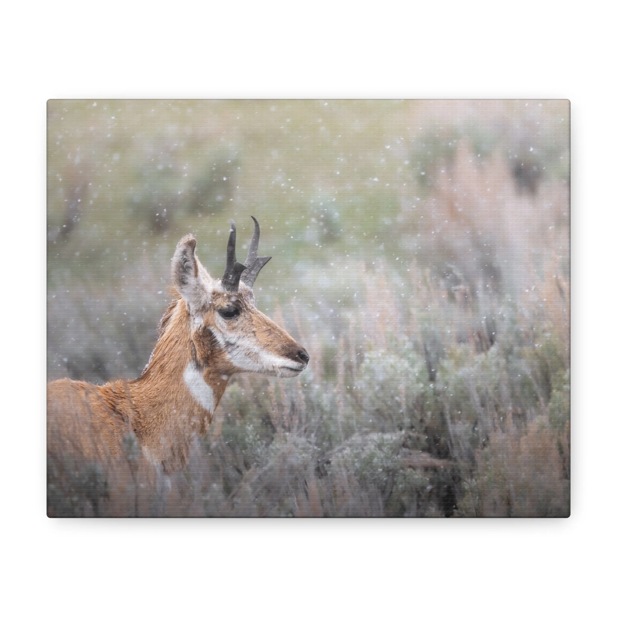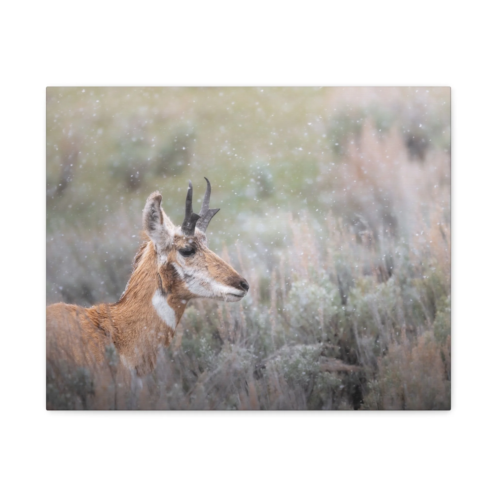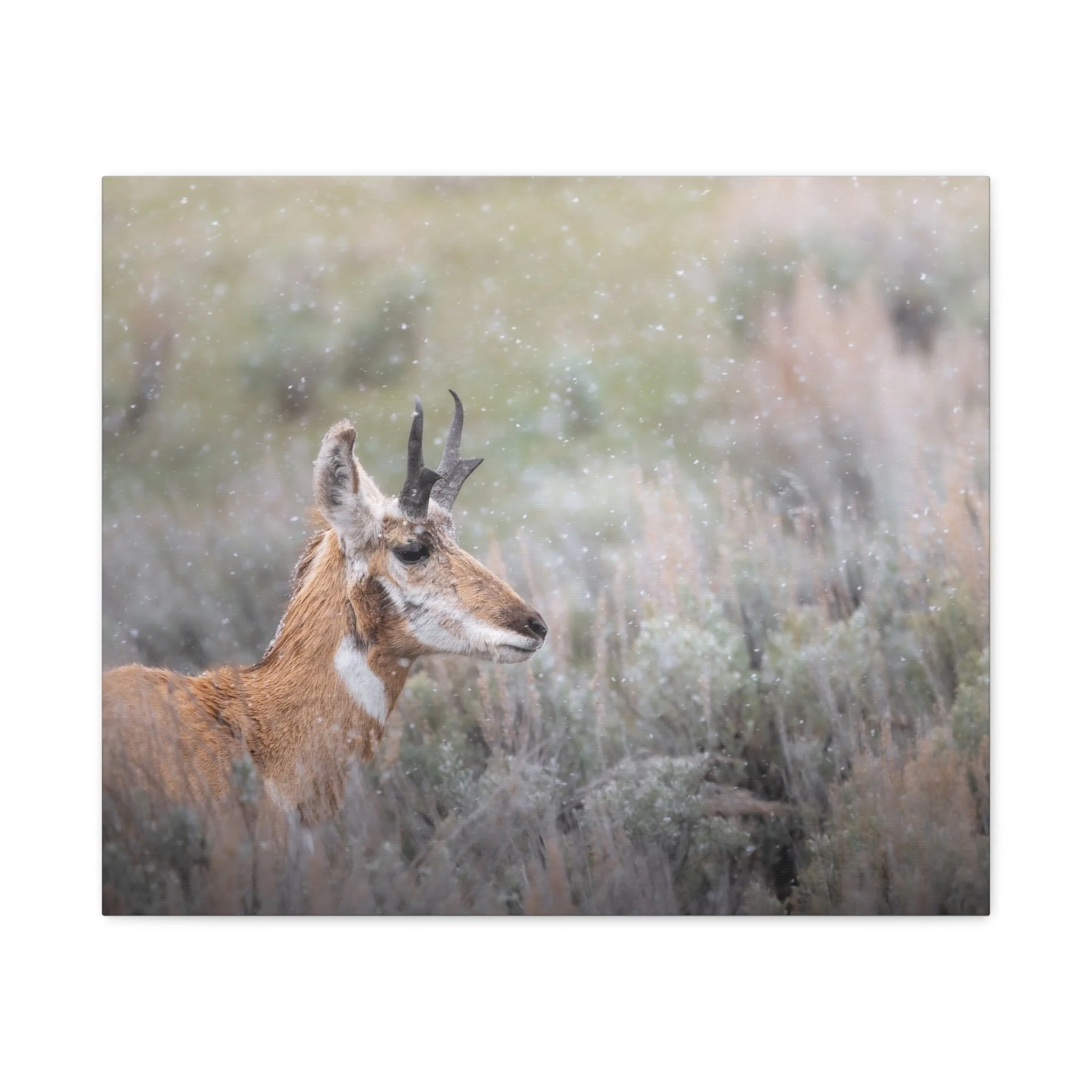 A quiet winter scene captured on stretched matte canvas: a pronghorn stands steady beneath a gentle snowfall, each flake softening the landscape and drawing the eye to the animal’s delicate silhouette. The muted, non-gloss surface keeps reflections low and invites you to step closer and linger on texture and detail. Hung in a living room, entryway, or rustic study, this canvas brings a calm, snowy moment indoors — the hush of a cold morning, the focused stillness of wildlife watching its world. The natural pine frame and subtle, archival-quality inks give the piece an organic feel that complements wood, leather, and layered textiles. It’s made to settle into a space where quiet observation and simple beauty matter.