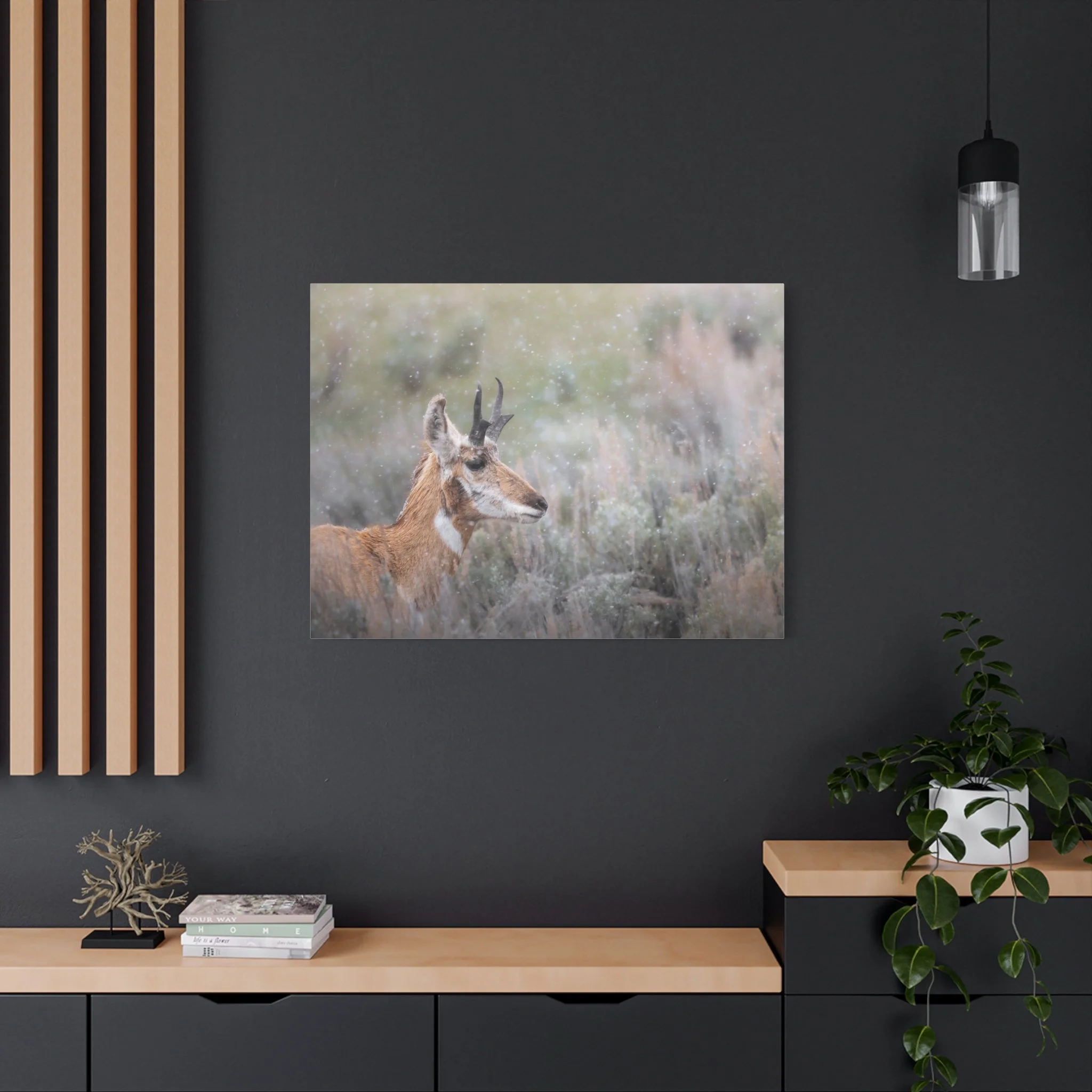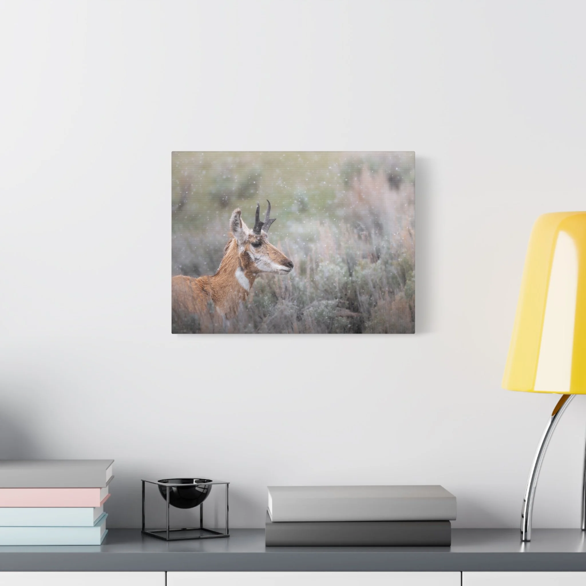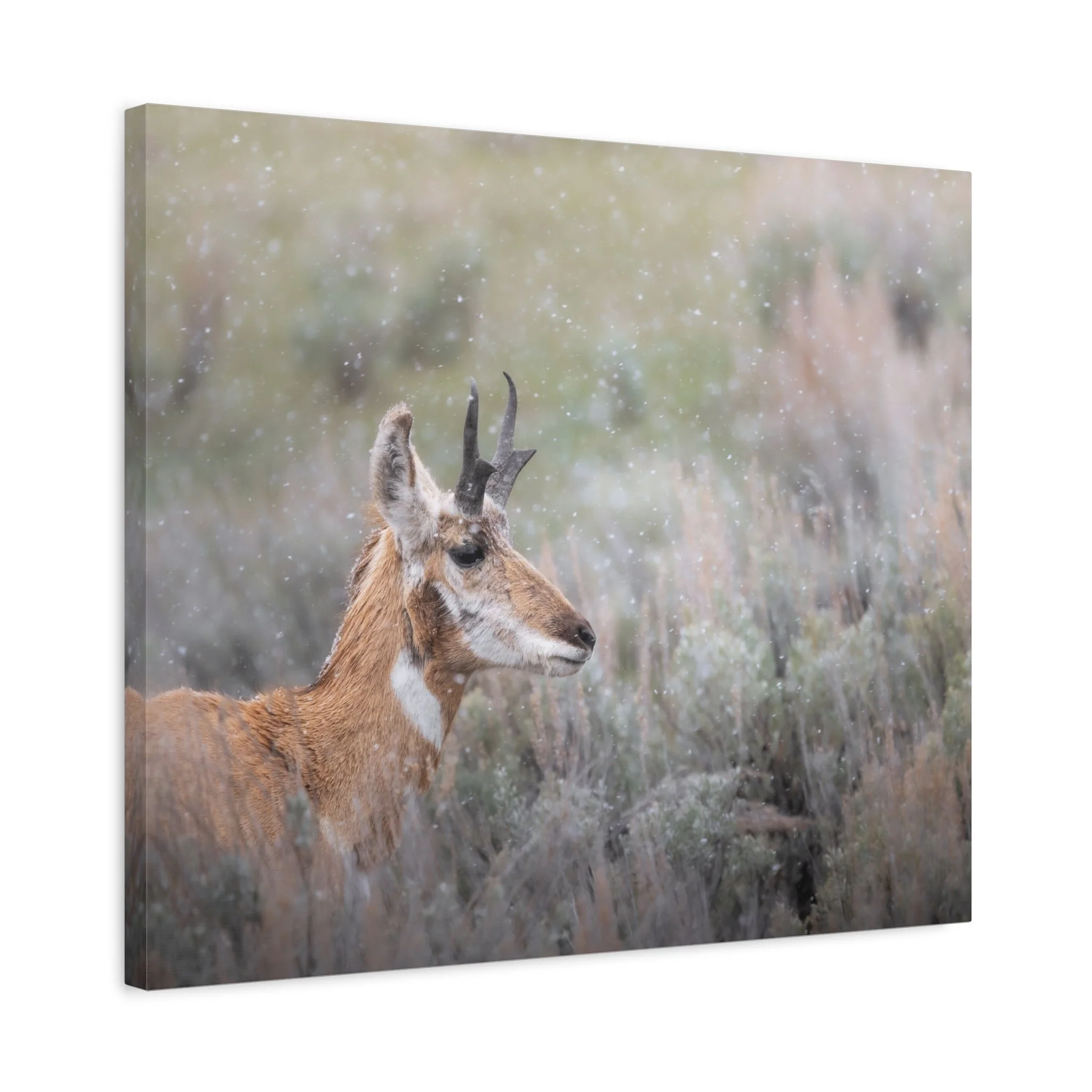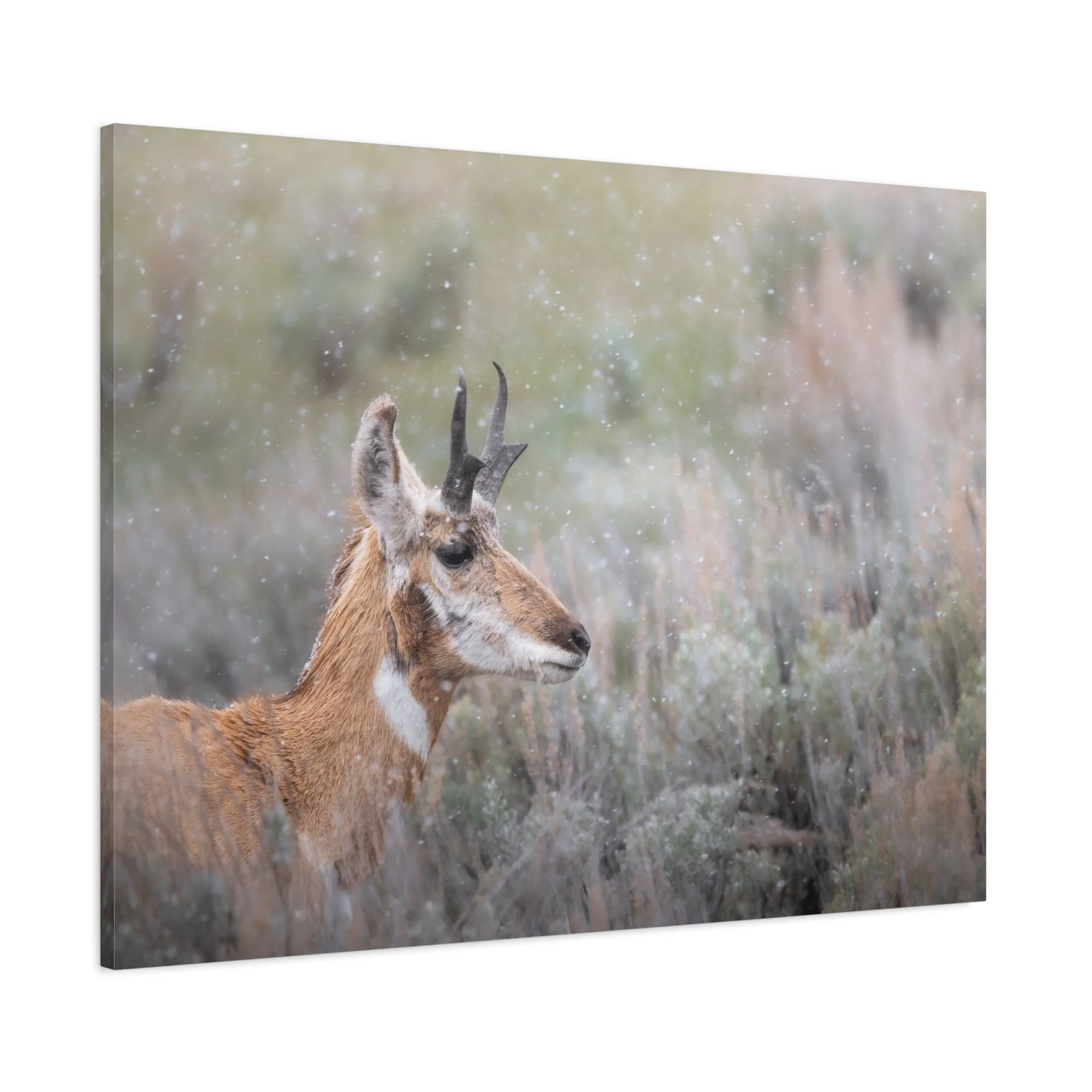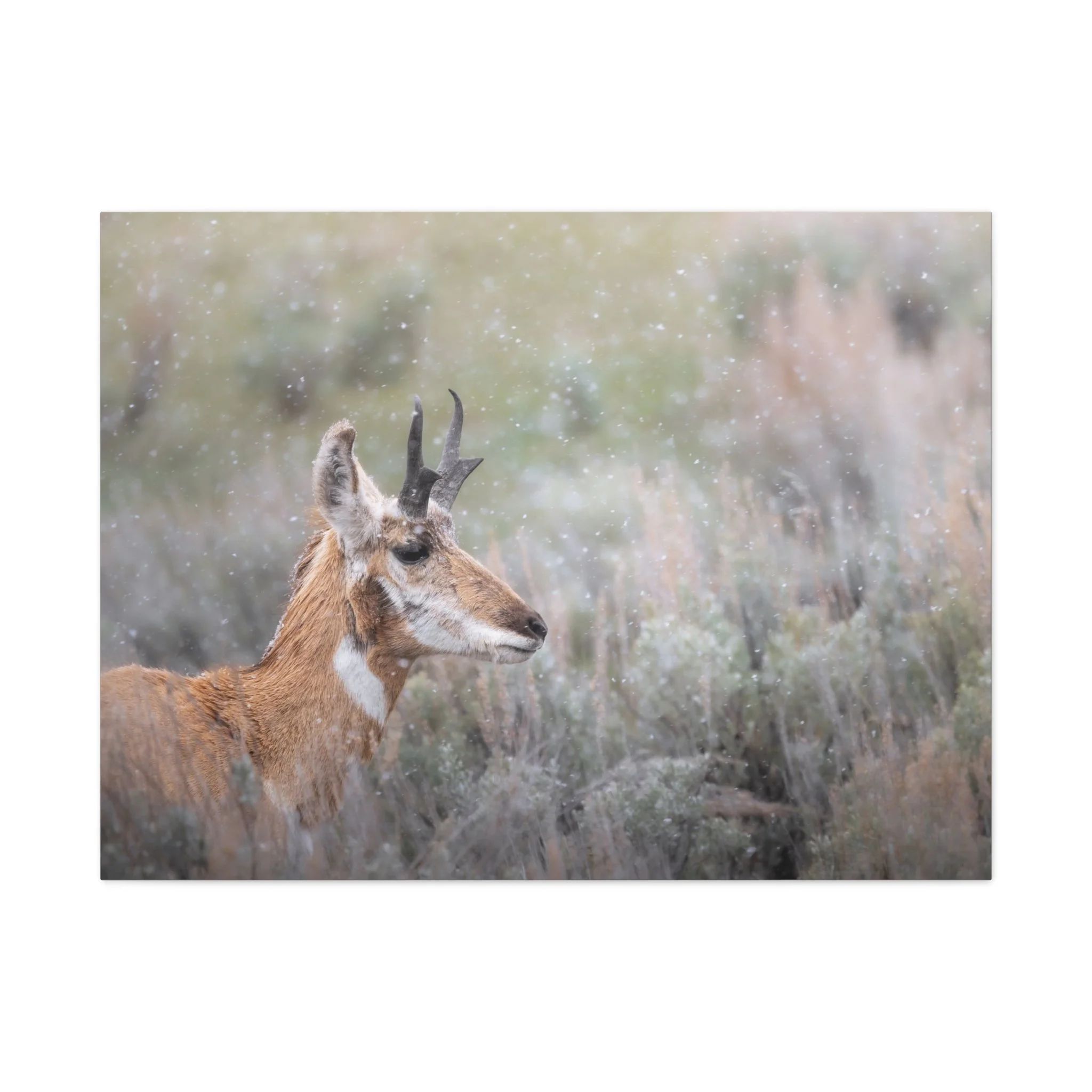 A quiet winter scene captured on stretched matte canvas: a pronghorn stands steady beneath a gentle snowfall, each flake softening the landscape and drawing the eye to the animal’s delicate silhouette. The muted, non-gloss surface keeps reflections low and invites you to step closer and linger on texture and detail. Hung in a living room, entryway, or rustic study, this canvas brings a calm, snowy moment indoors — the hush of a cold morning, the focused stillness of wildlife watching its world. The natural pine frame and subtle, archival-quality inks give the piece an organic feel that complements wood, leather, and layered textiles. It’s made to settle into a space where quiet observation and simple beauty matter.