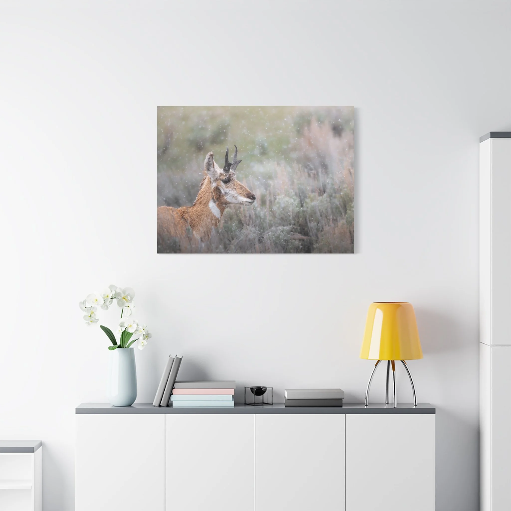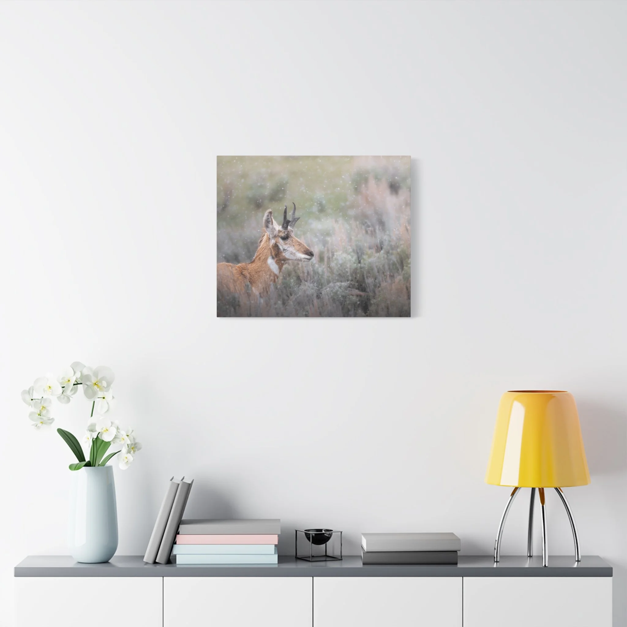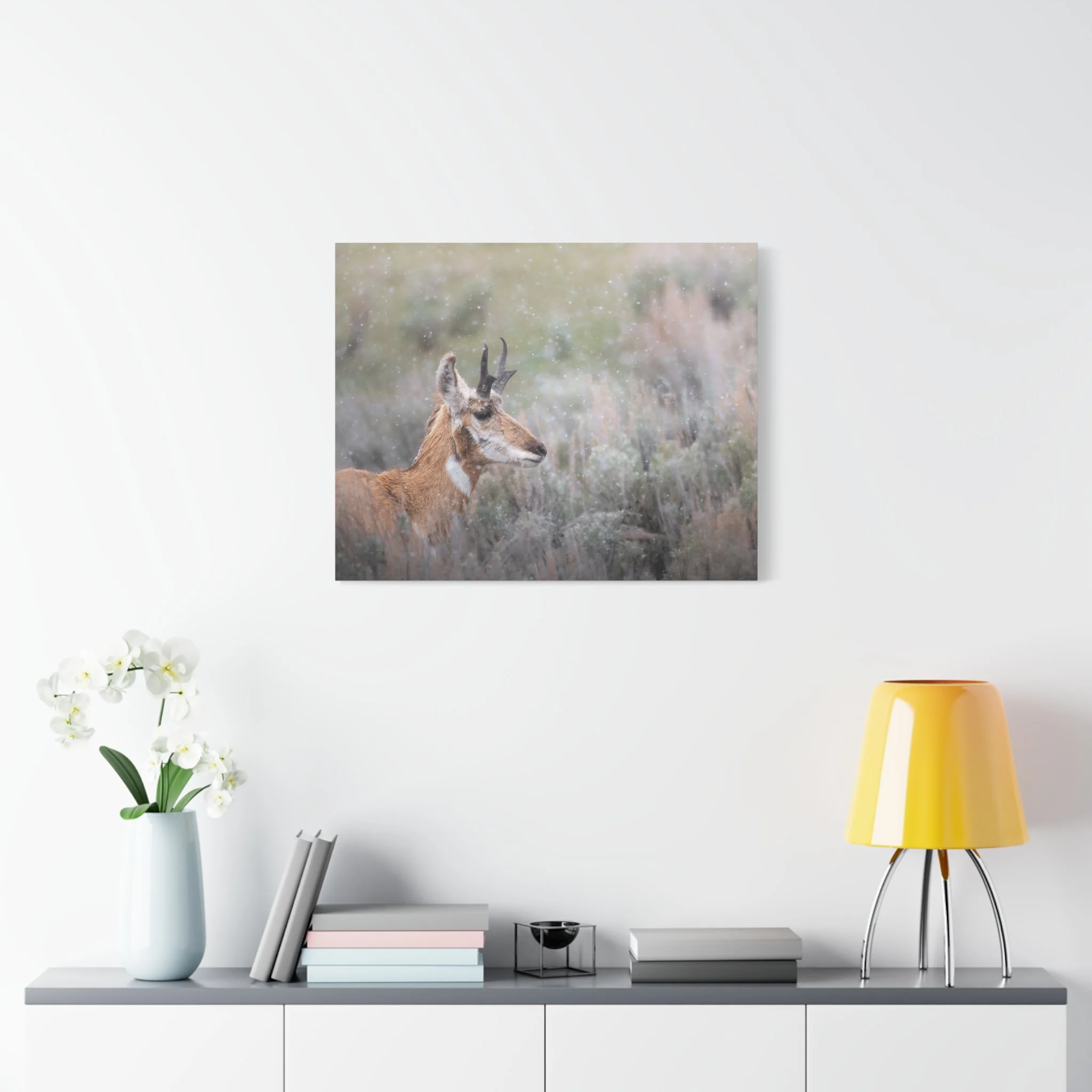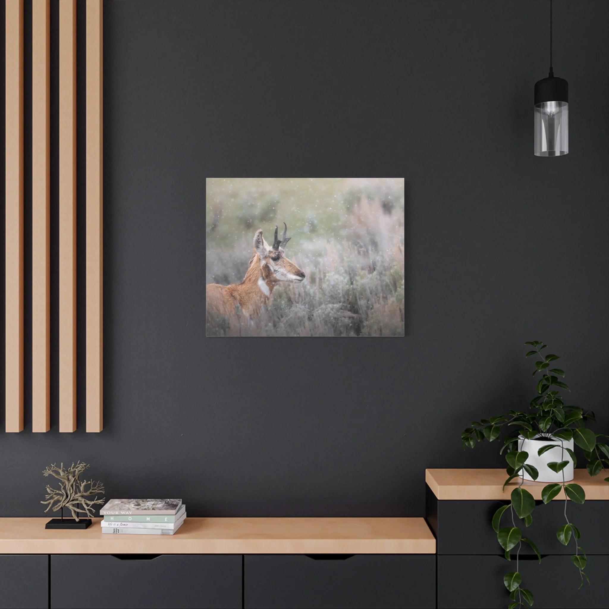 A quiet winter scene captured on stretched matte canvas: a pronghorn stands steady beneath a gentle snowfall, each flake softening the landscape and drawing the eye to the animal’s delicate silhouette. The muted, non-gloss surface keeps reflections low and invites you to step closer and linger on texture and detail. Hung in a living room, entryway, or rustic study, this canvas brings a calm, snowy moment indoors — the hush of a cold morning, the focused stillness of wildlife watching its world. The natural pine frame and subtle, archival-quality inks give the piece an organic feel that complements wood, leather, and layered textiles. It’s made to settle into a space where quiet observation and simple beauty matter.