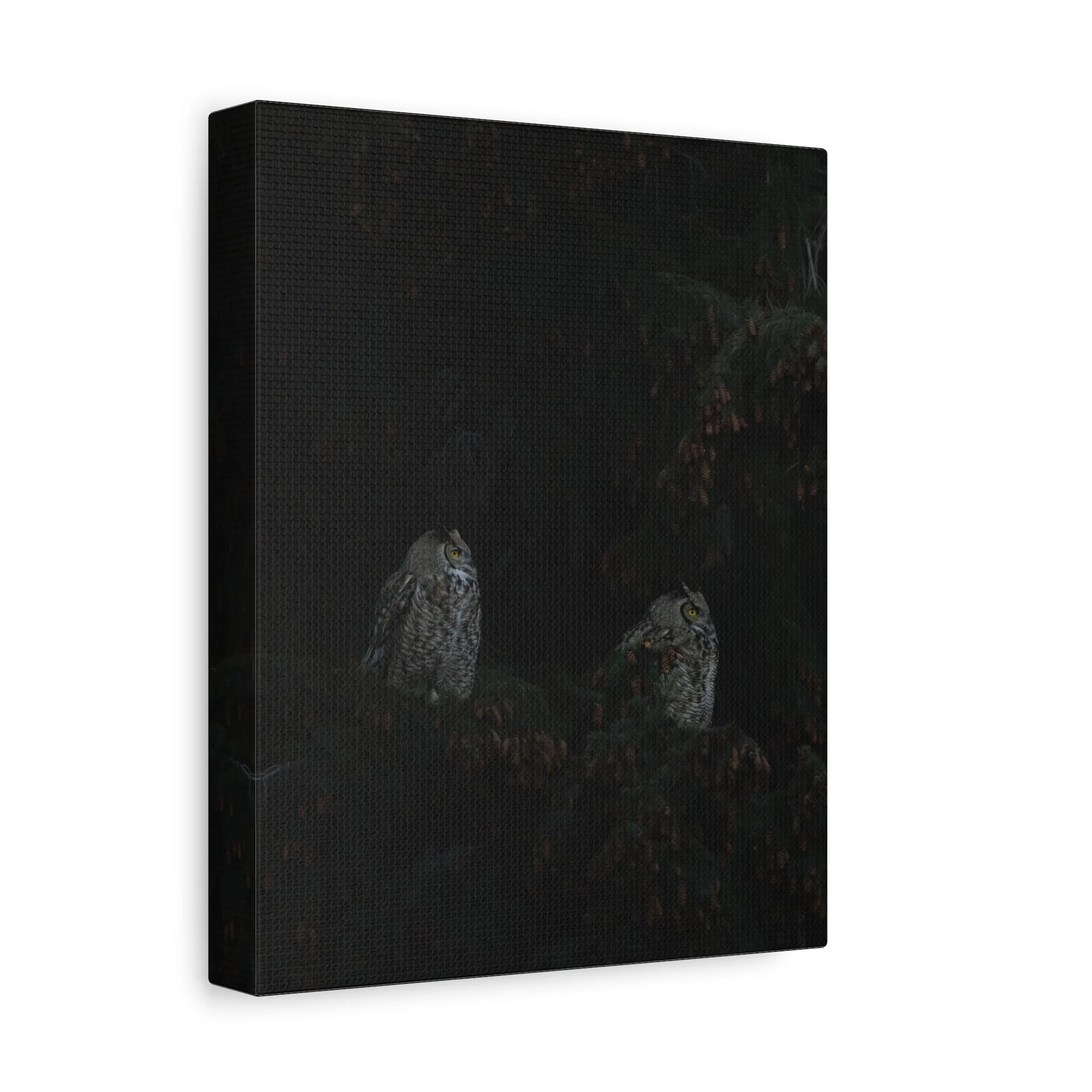 A quietly striking stretched canvas that brings the watchful calm of a mated pair of great horned owls into your room. The matte surface softens light and texture, letting the owls’ layered feathers and steady gaze anchor a living room wall, a reading nook, or a cabin hallway. Printed with Greenguard Gold latex inks on a durable cotton-poly canvas, the image keeps its rich detail without glare. The profile-stretched pine frame adds subtle depth at 1.25" and the soft rubber dots on the back keep the piece steady on the wall. Choose from multiple orientations and sizes to find the scale that makes the owls part of your space — intimate above a bedside table or commanding over a mantel. It’s a calm, natural presence that settles into homes where quiet evenings, woodsmoke stories, and close-up nature moments matter.