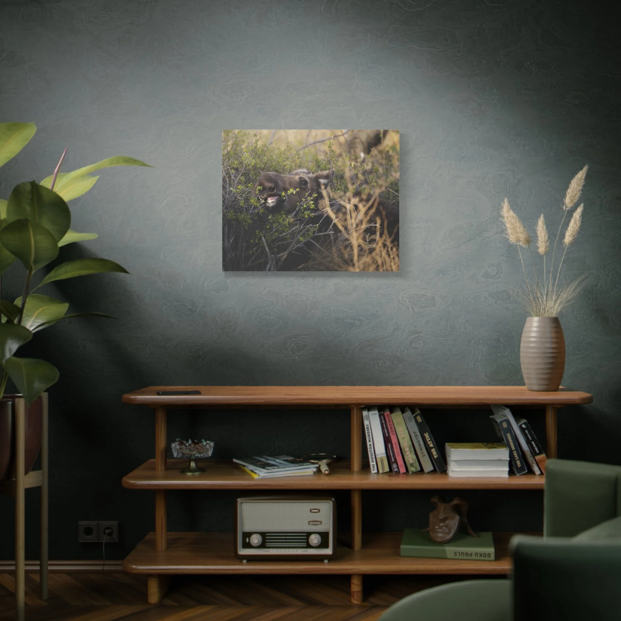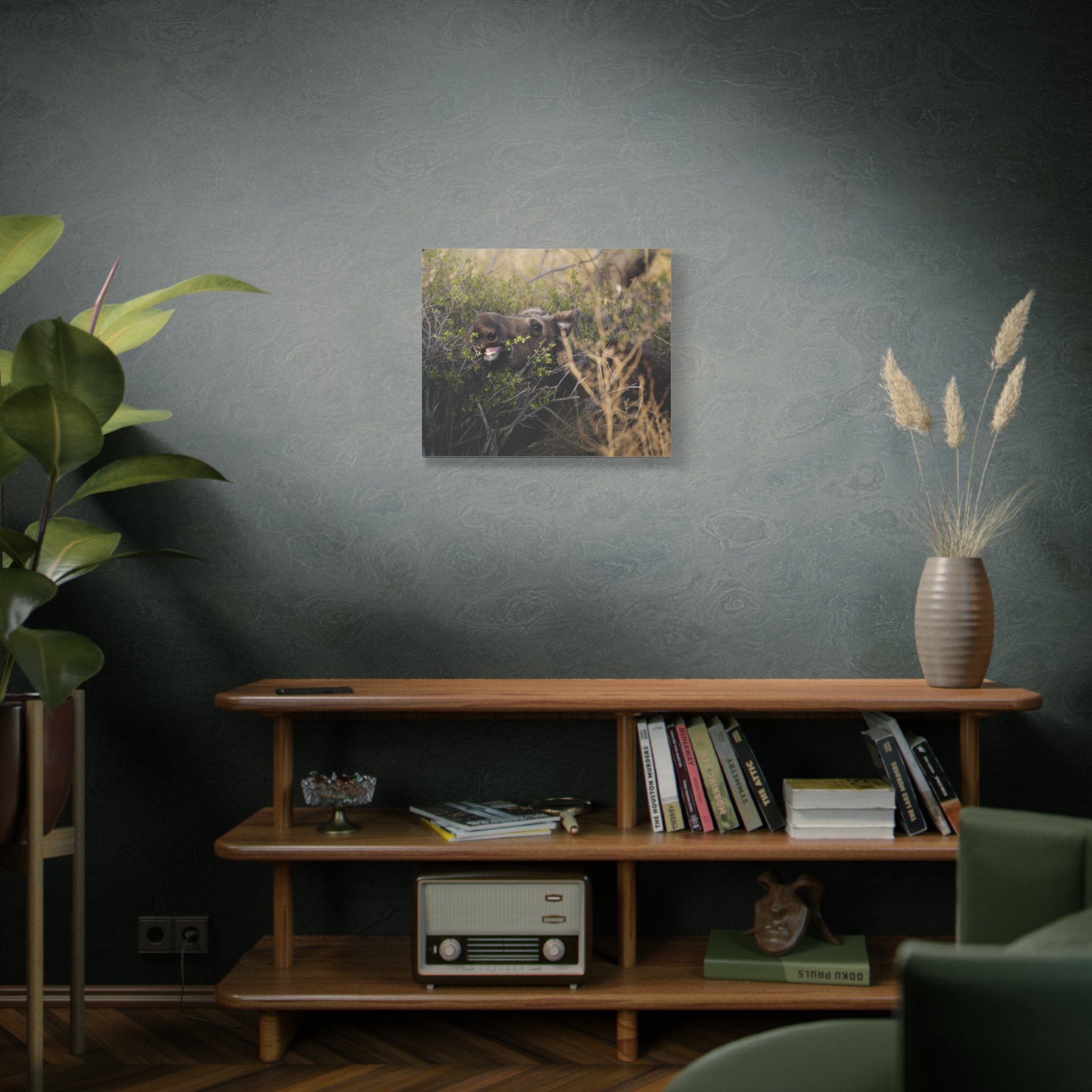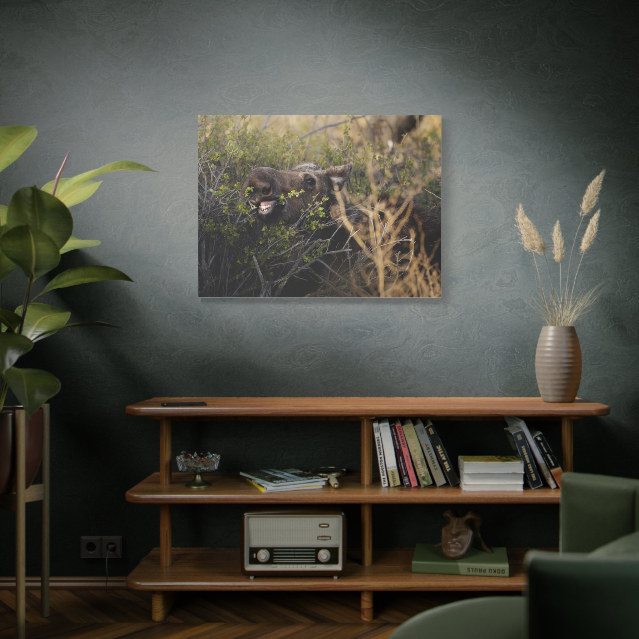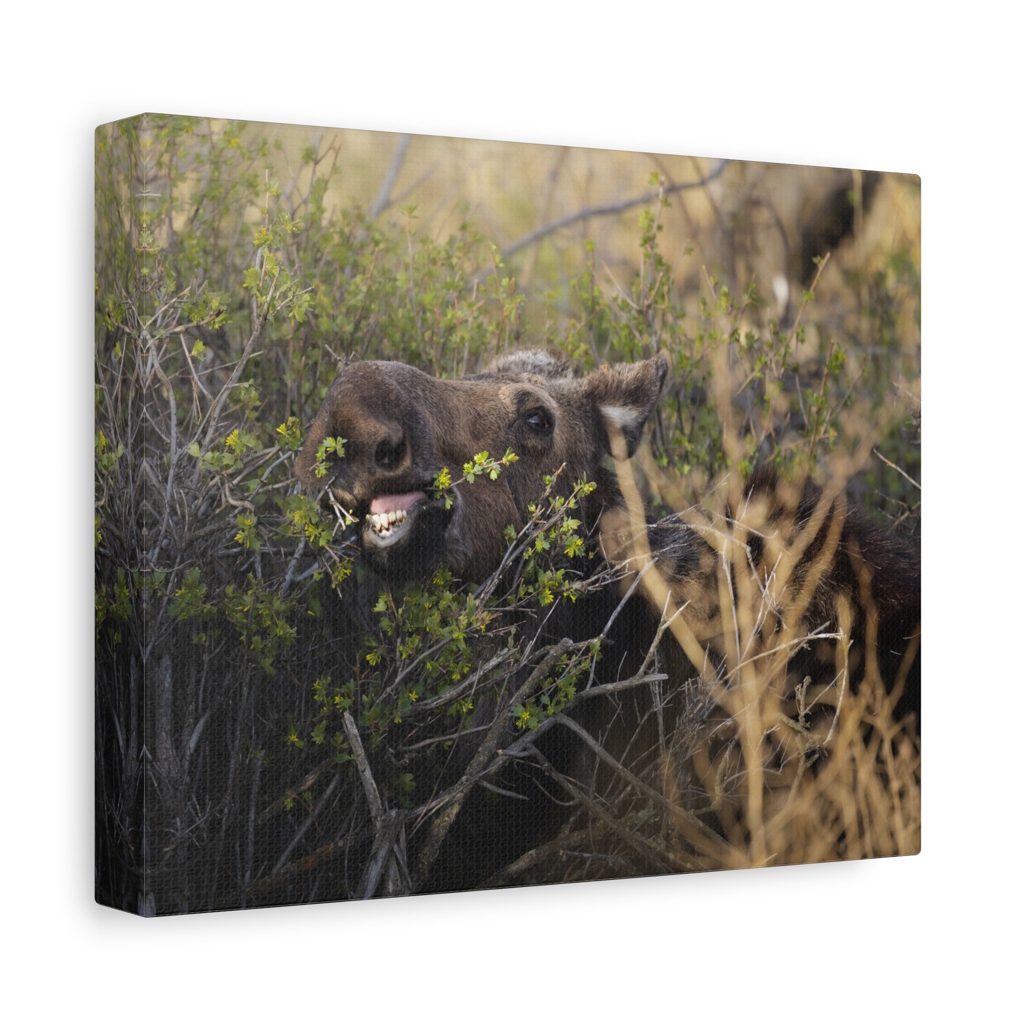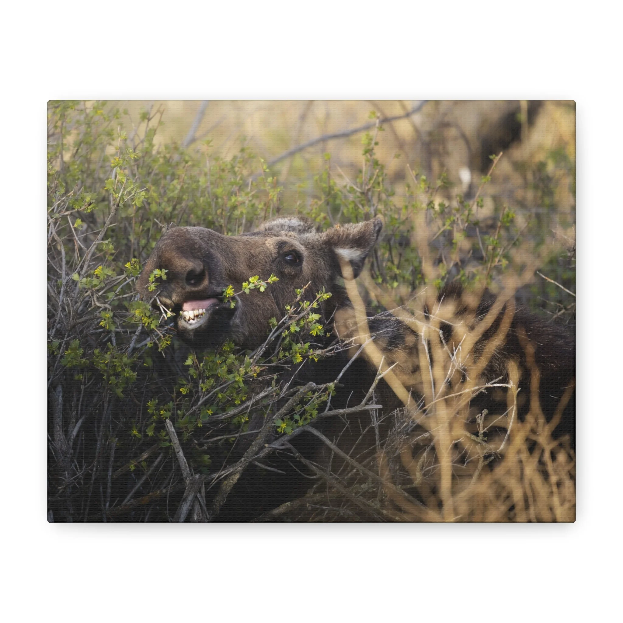 A matte stretched canvas that captures a raw woodland moment: a moose caught mid-meal, mouth open and teeth visible, bringing a silly wildlife encounter onto your wall. The neutral matte finish and tight 1.25" profile let the texture of the canvas and the animal’s rugged presence take center stage. Hang it in a living room, cabin entry, or study to invite a quiet, slightly wild energy into the space—like a breath of pine and wind after a walk through the trees.
