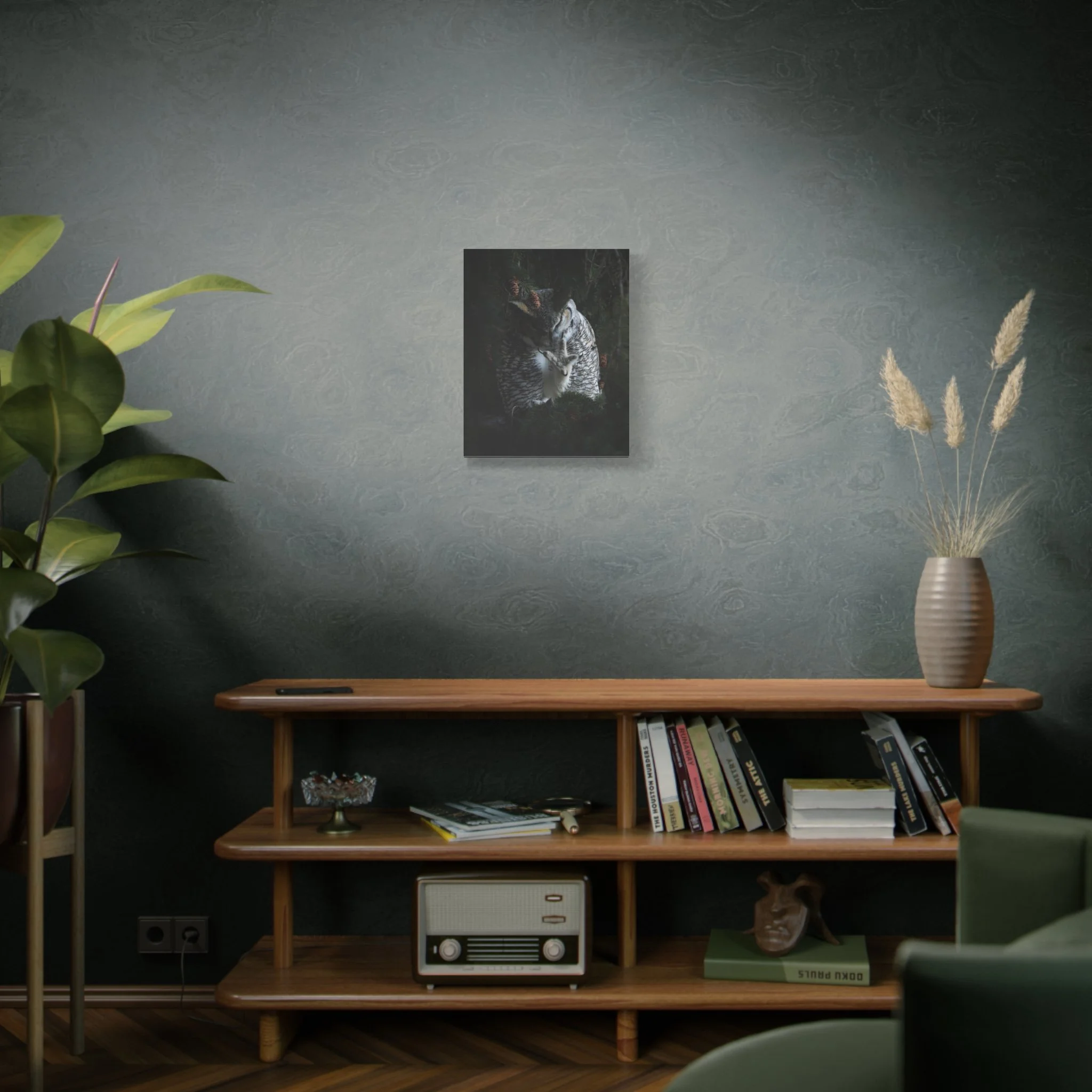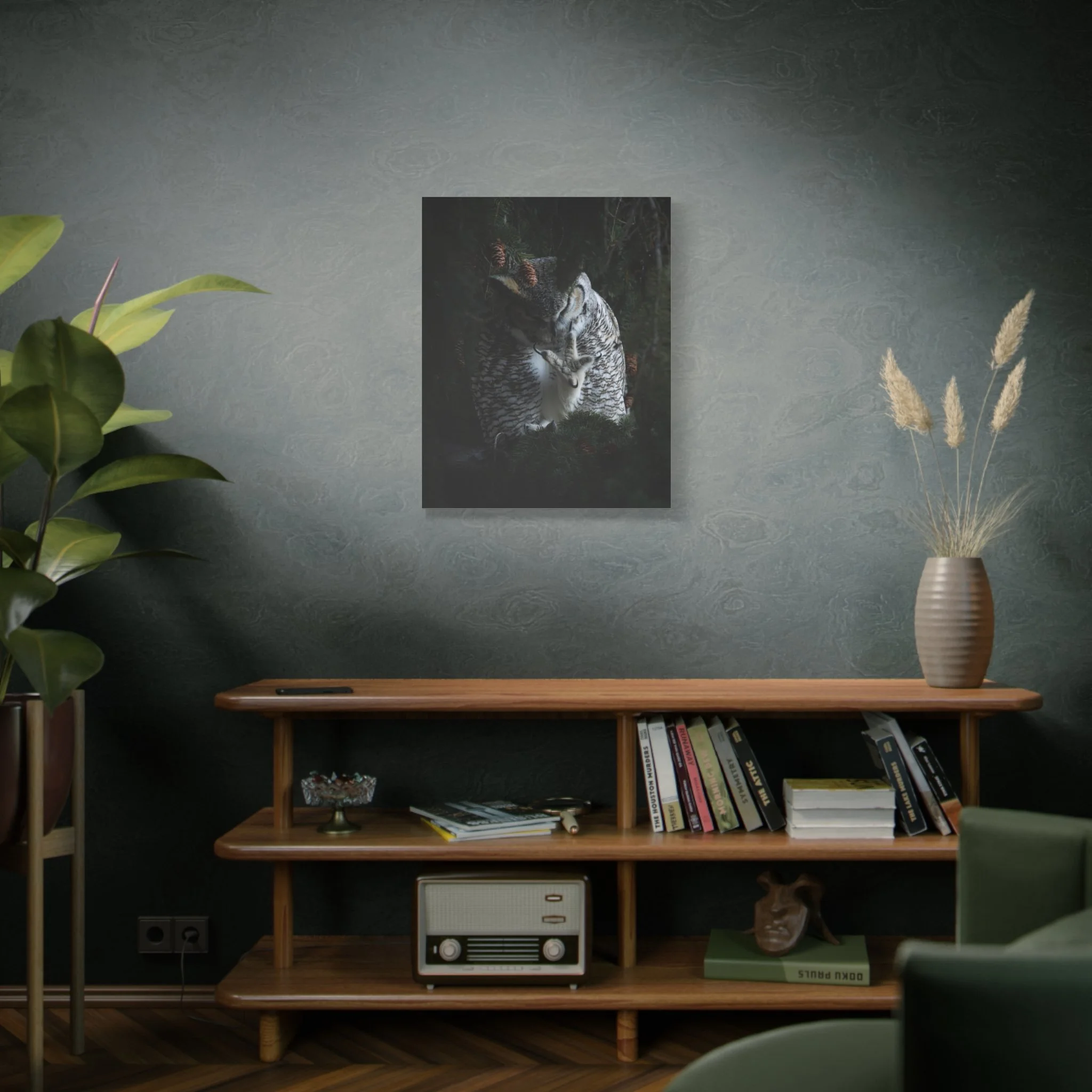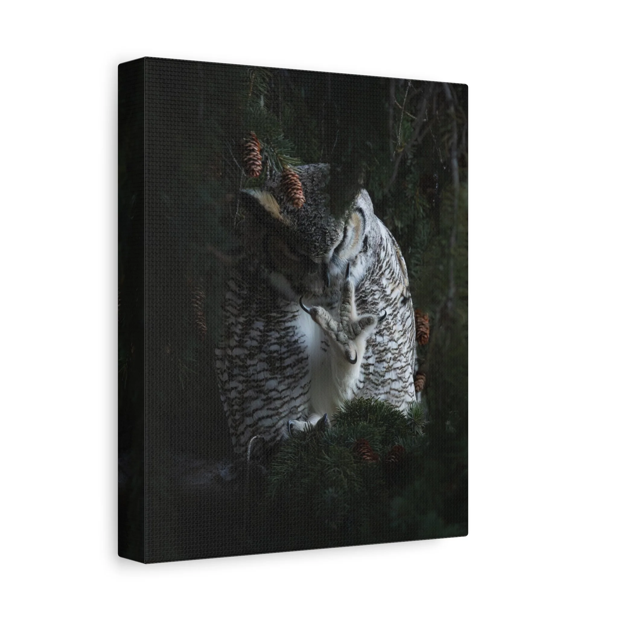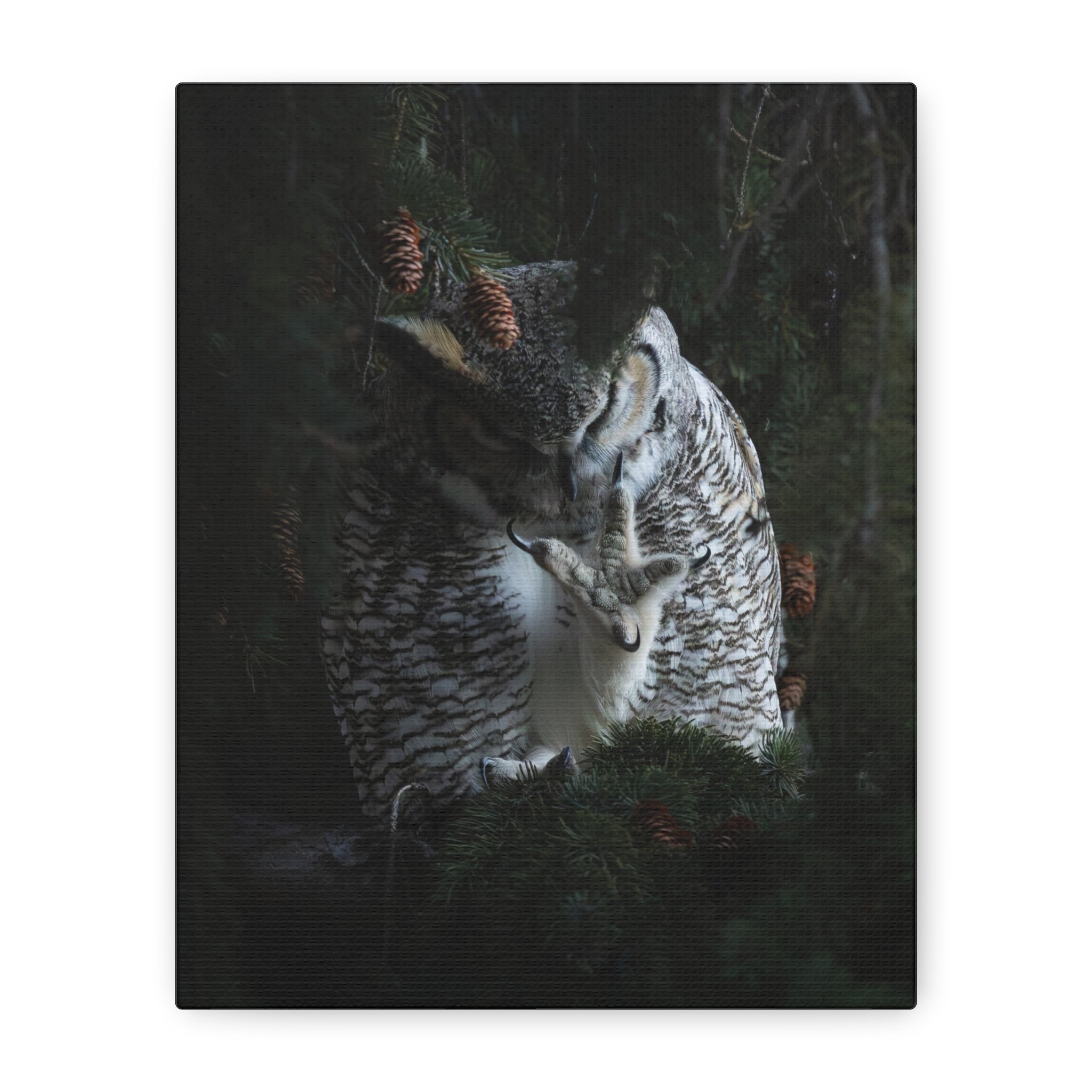 A matte stretched canvas print that brings the quiet intensity of a great horned owl into your space. The muted, non-reflective surface draws you in, emphasizing feather and talon details that hold your gaze. Mounted on sustainably sourced radial pine and printed with UL-certified Greenguard Gold latex inks, this piece balances gallery-quality clarity with responsible materials. It hangs flush and steady against the wall thanks to soft rubber dots and an included back hanging system. Choose from multiple orientations and sizes to let the owl preside over a reading nook, entryway, or cabin wall—an atmospheric focal point that feels both wild and thoughtfully made.