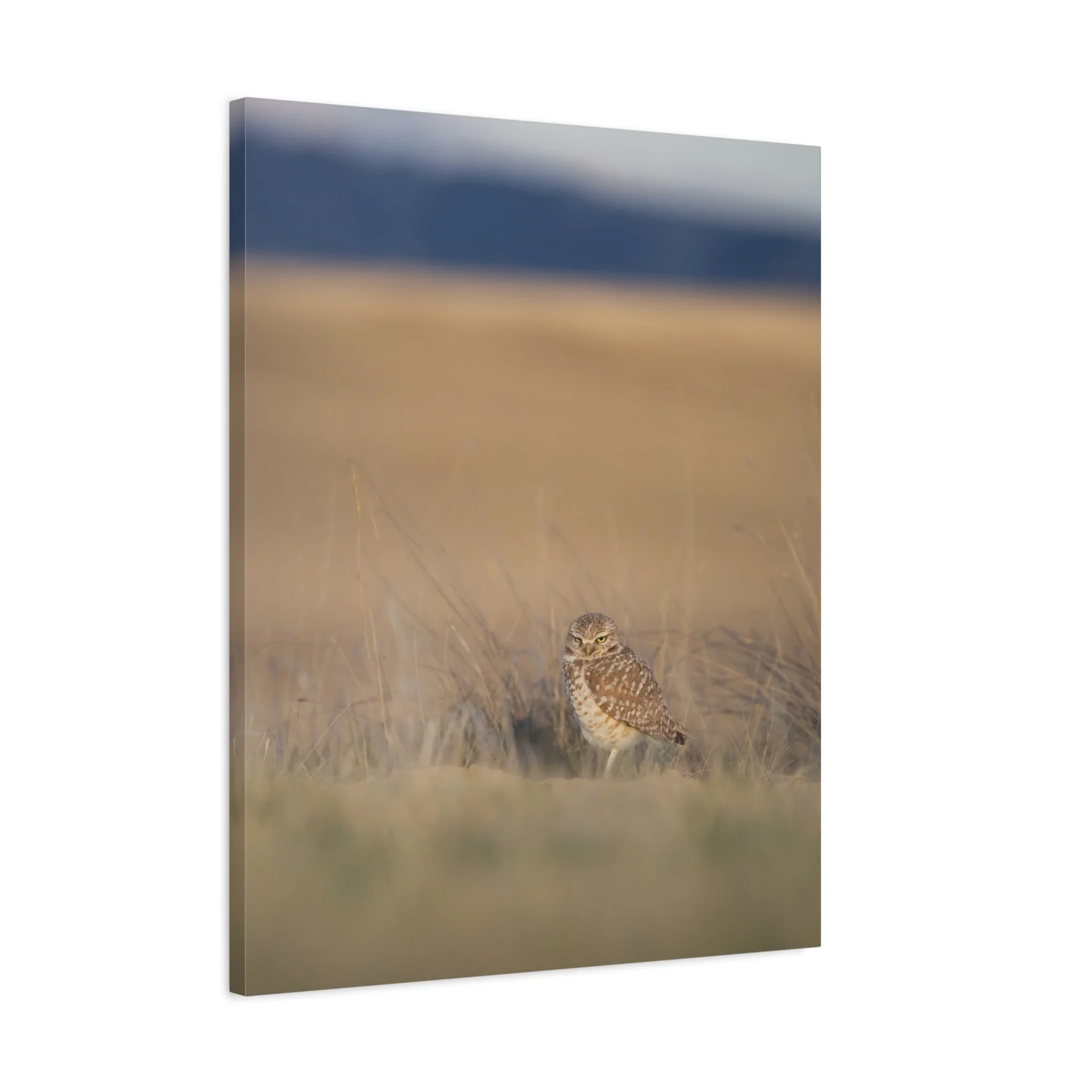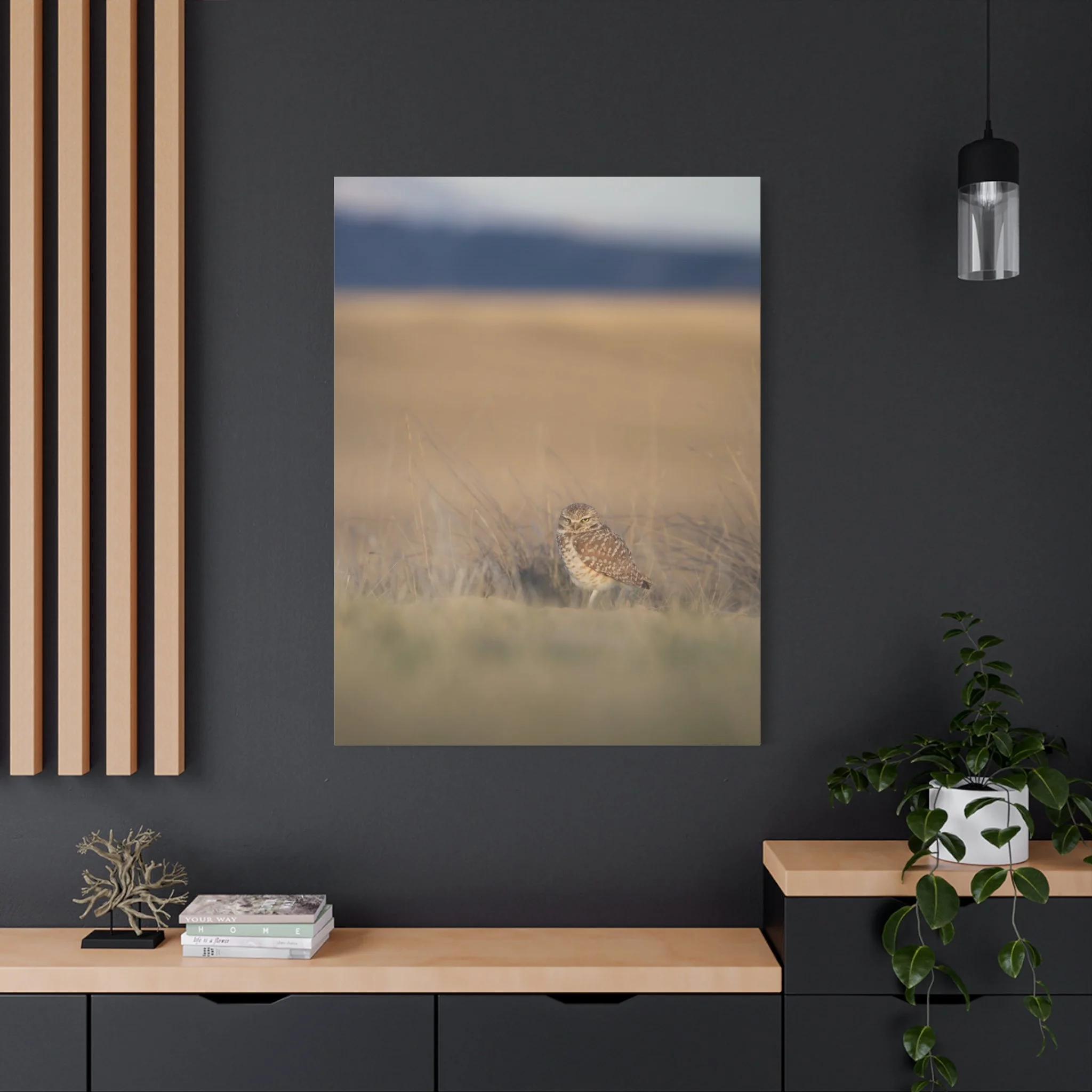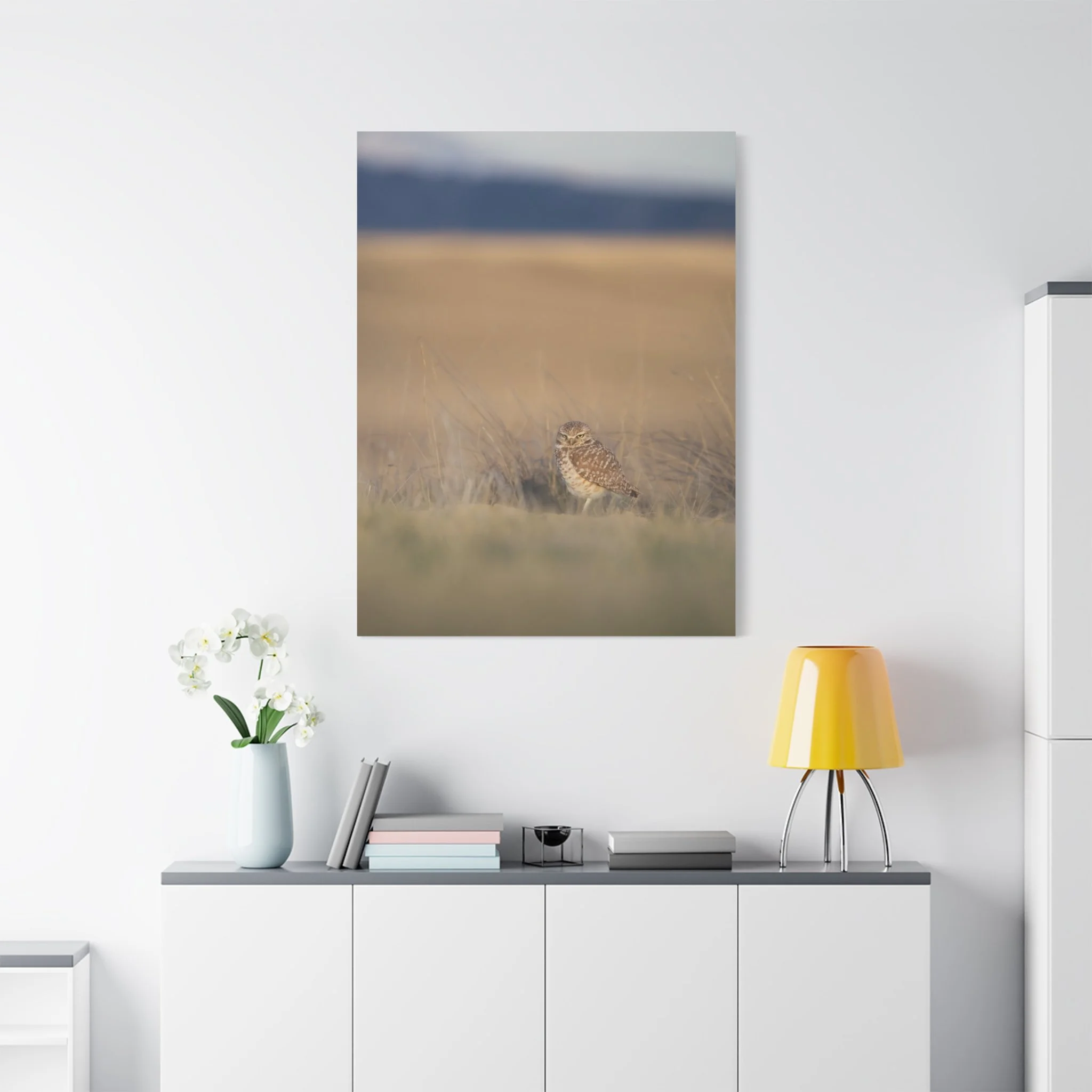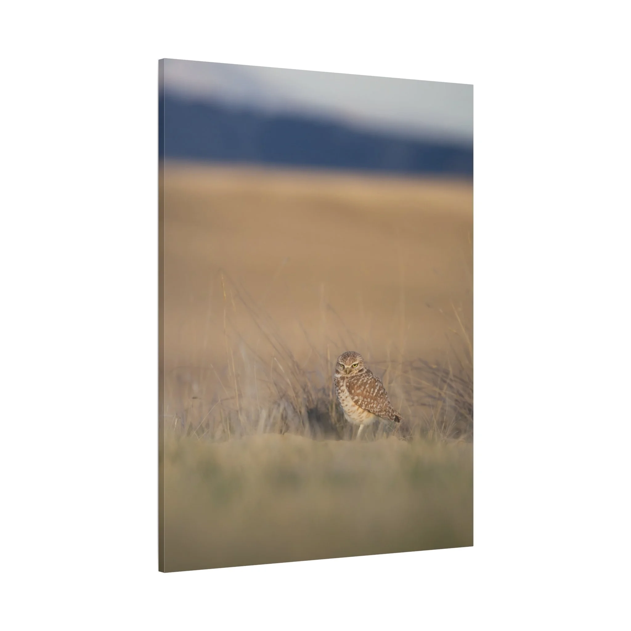 A silent moment captured on matte canvas: a burrowing owl - eyes fixed on the earth as twilight tightens. The stretched canvas texture brings out feather detail and muted earth tones, giving the scene a tactile, intimate presence on your wall. Hang it in a reading nook, study, or entryway to invite a pause — a small, wild witness to the rhythms of dusk. The subtle matte finish keeps glare away, so the owl’s furtive gaze reads clearly from across the room. This piece fits into calm, nature-focused spaces where quiet observation and a connection to the outdoors are treasured.