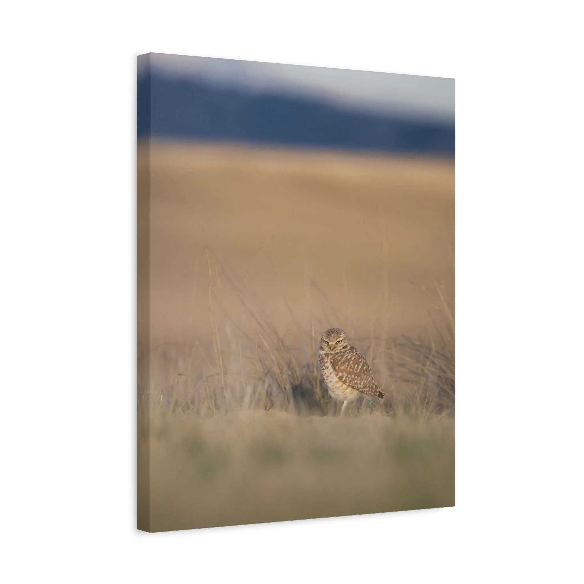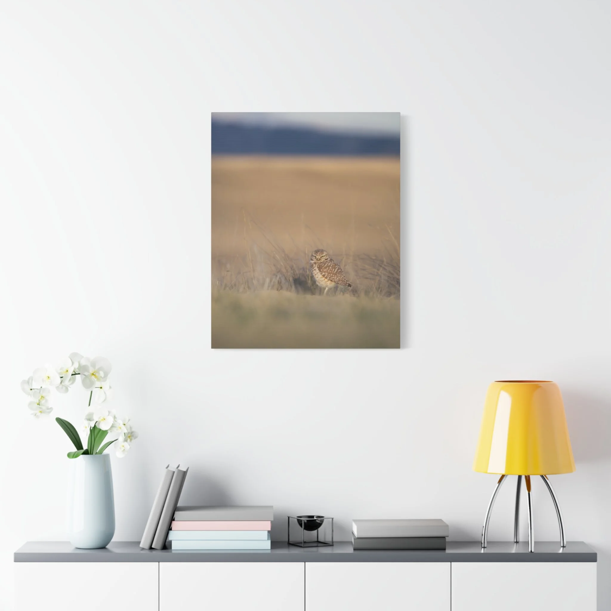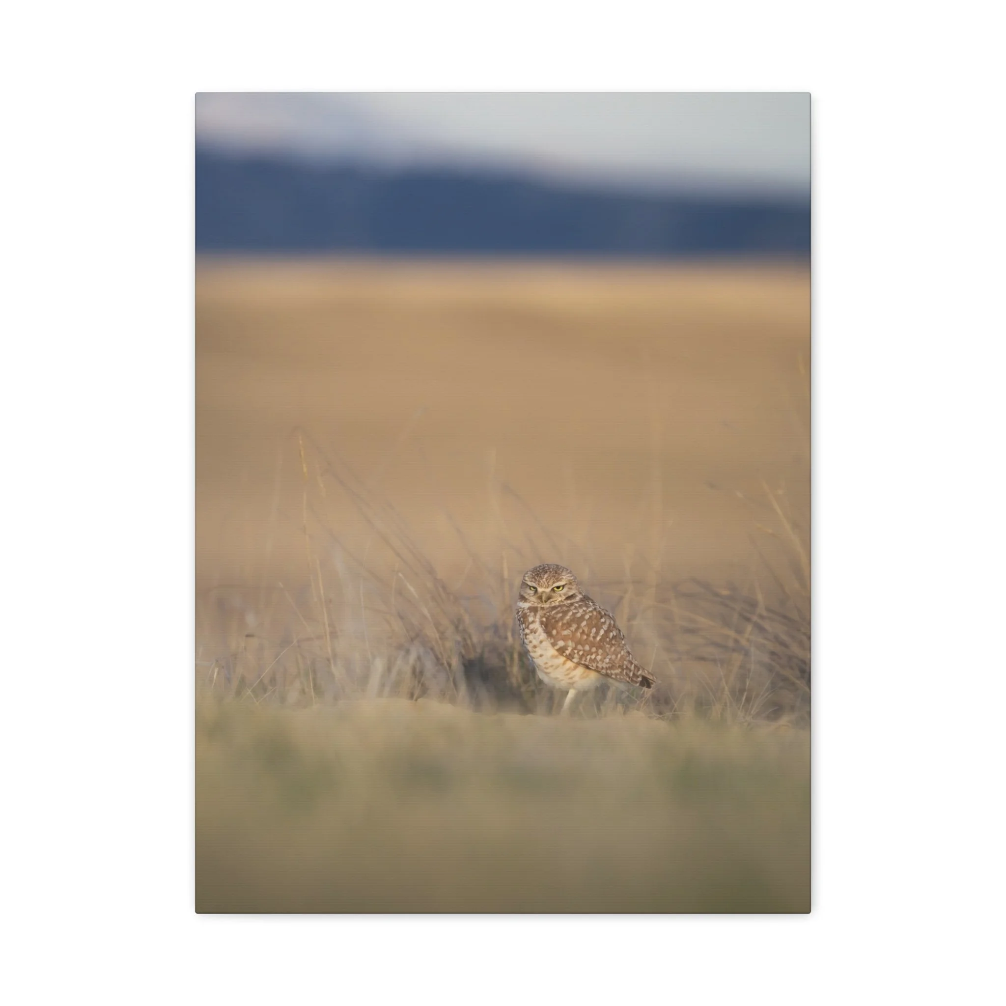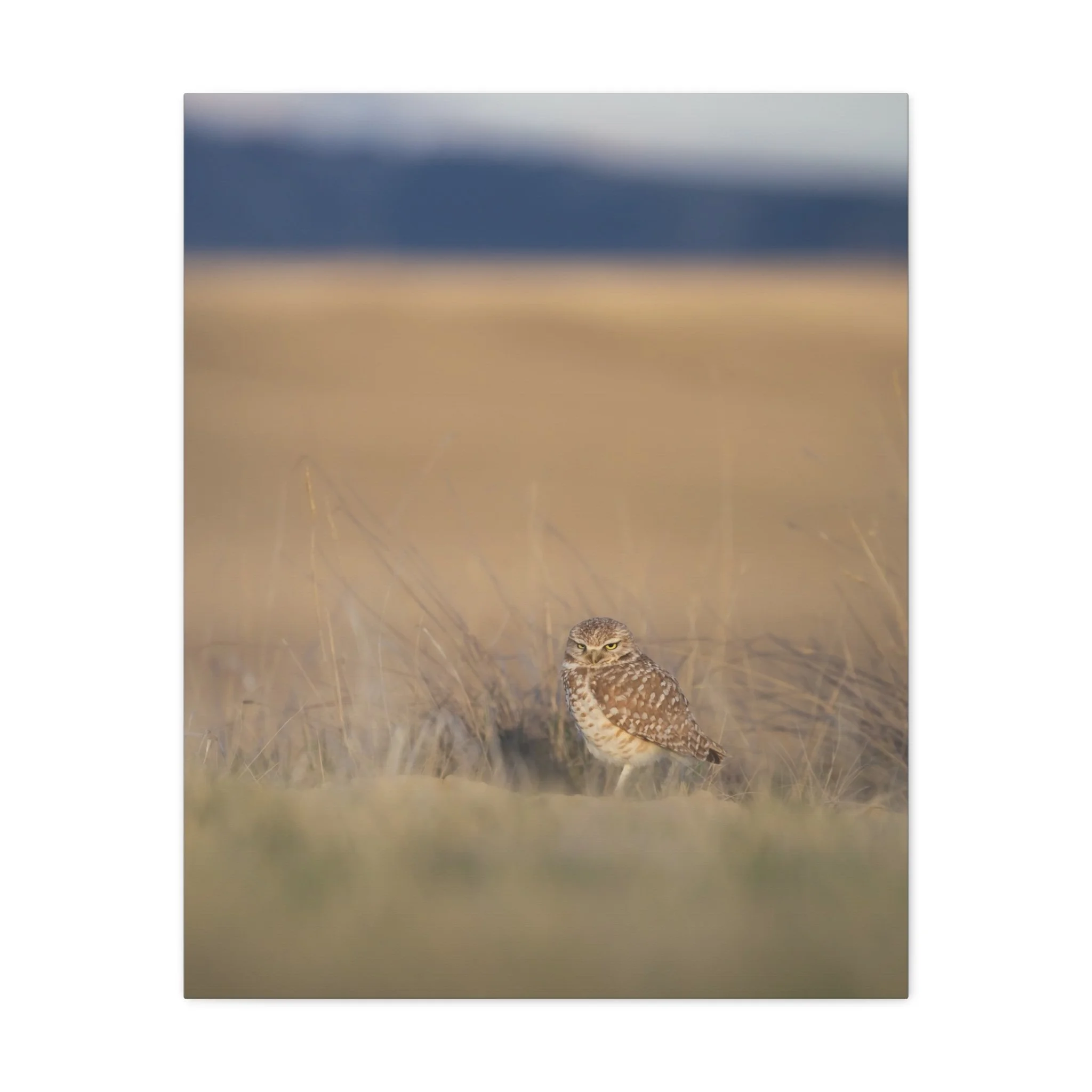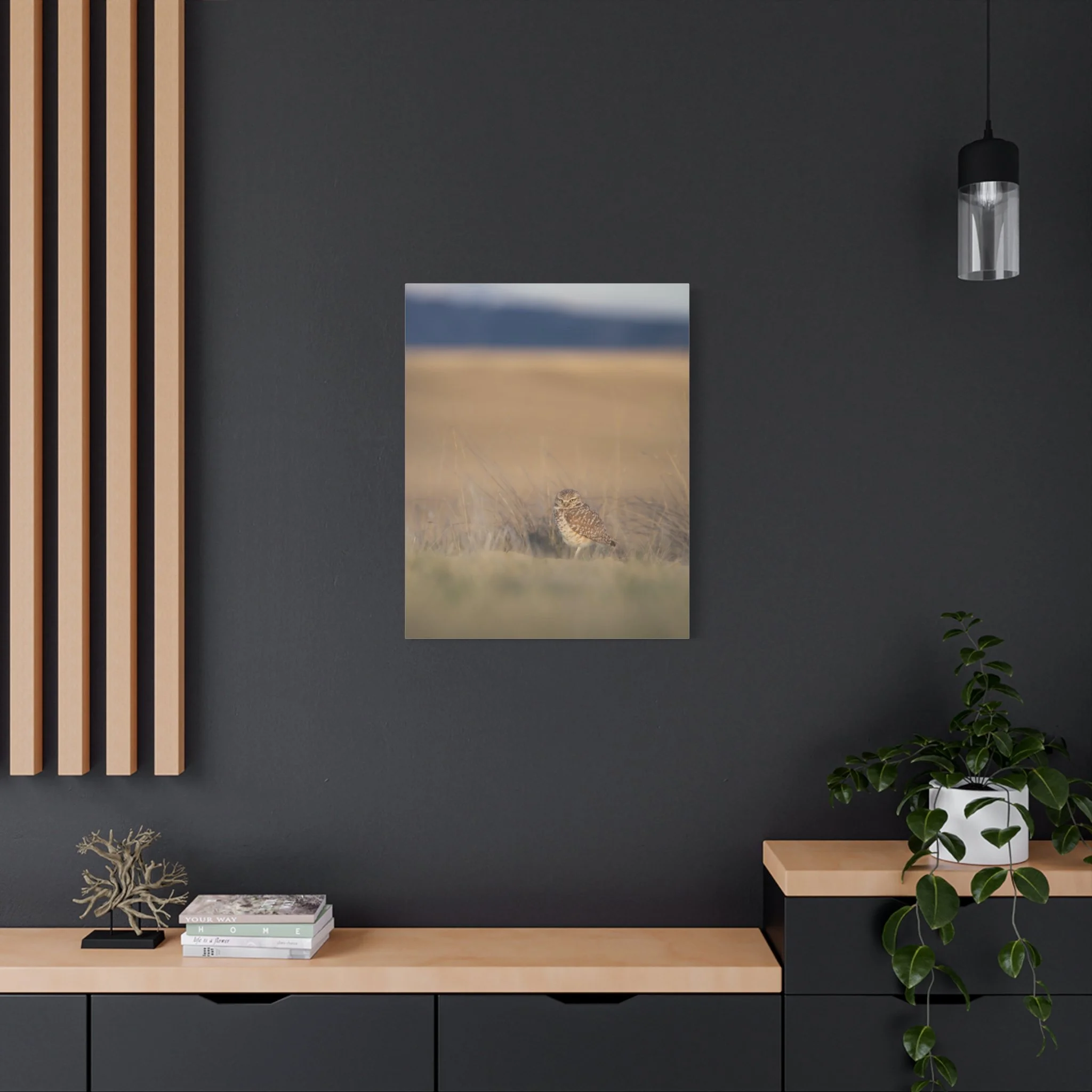A silent moment captured on matte canvas: a burrowing owl - eyes fixed on the earth as twilight tightens. The stretched canvas texture brings out feather detail and muted earth tones, giving the scene a tactile, intimate presence on your wall. Hang it in a reading nook, study, or entryway to invite a pause — a small, wild witness to the rhythms of dusk. The subtle matte finish keeps glare away, so the owl’s furtive gaze reads clearly from across the room. This piece fits into calm, nature-focused spaces where quiet observation and a connection to the outdoors are treasured.