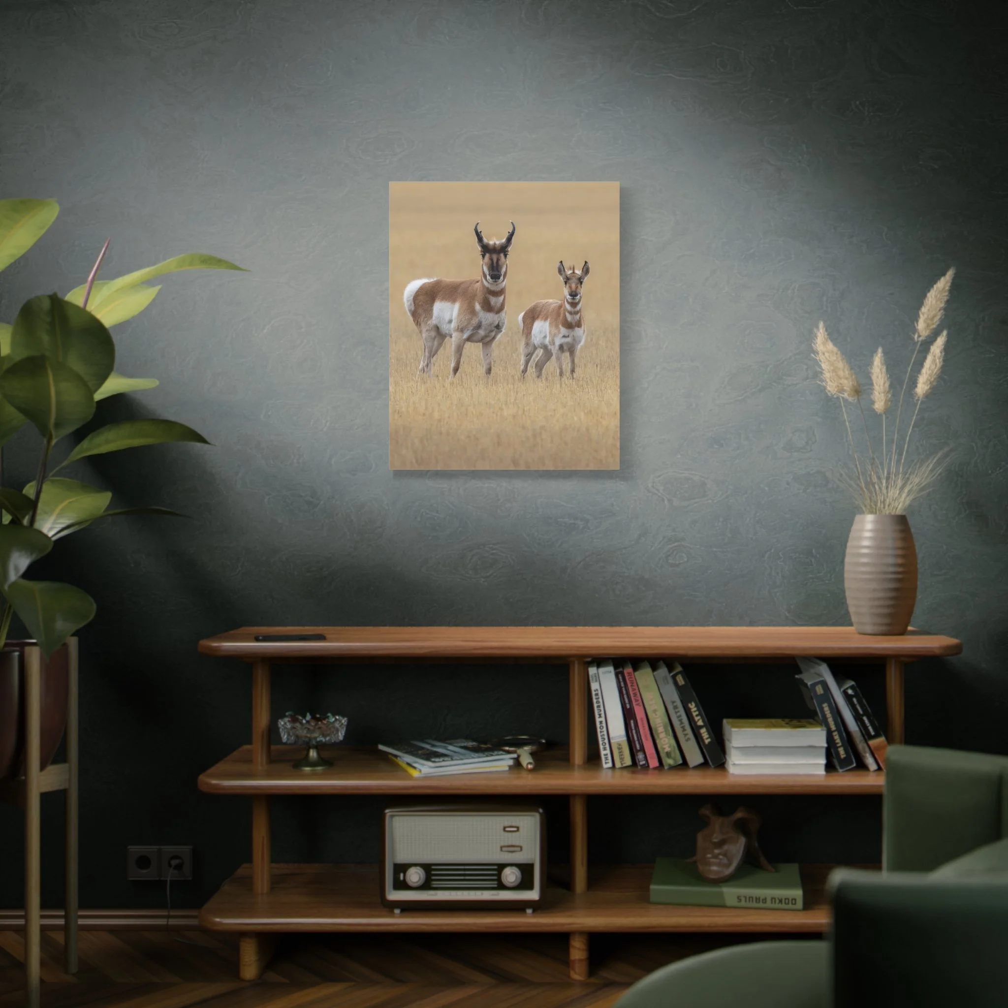 A matte stretched canvas print featuring two pronghorn rendered with crisp, archival-quality detail. The textured cotton-poly blend surface and special coating make colors and fine lines sing without glare. Mounted on a 1.25" radial pine frame sourced from responsibly managed forests, this lightweight piece hangs securely with included hardware and soft rubber dots that protect your wall and keep the print steady. The natural tones and clean composition bring a quiet, wild elegance to cabins, entryways, or any room where a whisper of open plains and swift movement is welcome. Each canvas is printed with low-VOC latex inks and assembled using sustainable materials — a subtle, lasting nod to both craftsmanship and conservation.