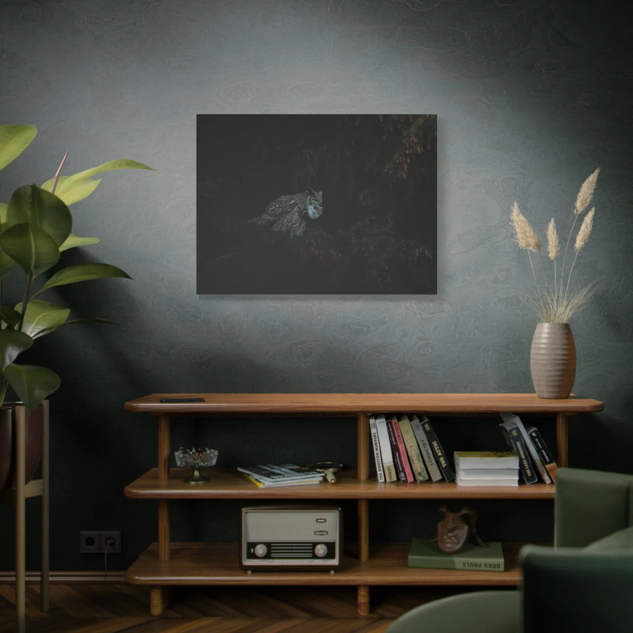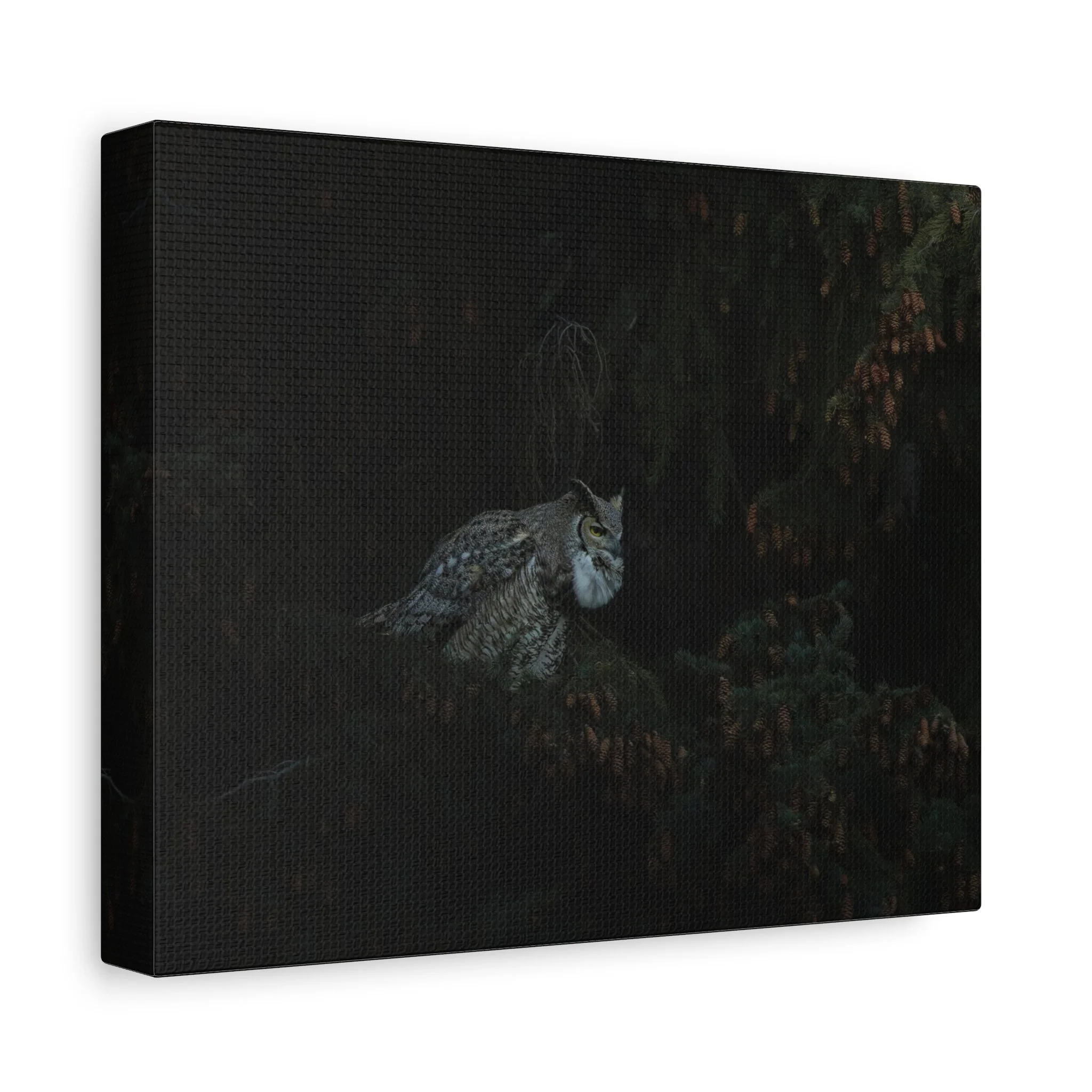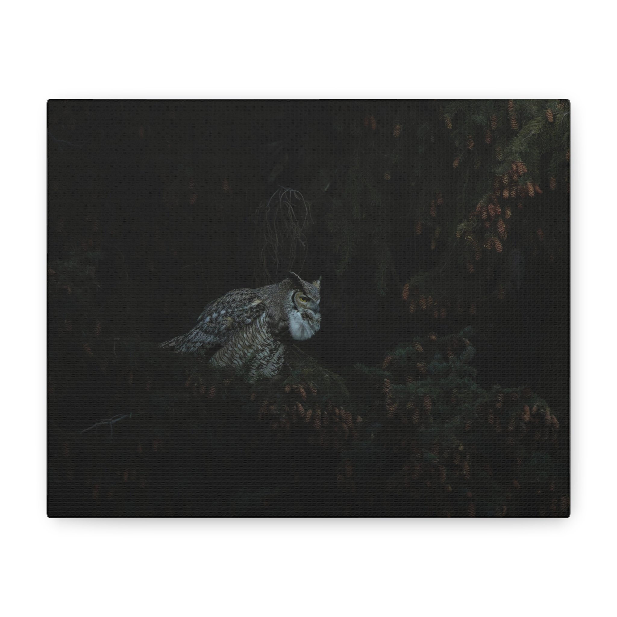 A striking matte canvas print of a great horned owl calling out to its mate. The muted matte finish keeps reflections low, letting the owl’s patterned feathers and intense gaze hold the room’s attention. Hung in a quiet corner or above a reading chair, this print brings a hush of evening woods — the steady heartbeat of the night, wings folded against shadow, and that single, resonant call cutting through still air. For birders, nature-lovers, or anyone who favors moody, contemplative décor, this canvas creates a place of calm and curiosity. The stretched profile gives the image presence on the wall while the soft rubber feet and included back-hanging make installation simple and secure.