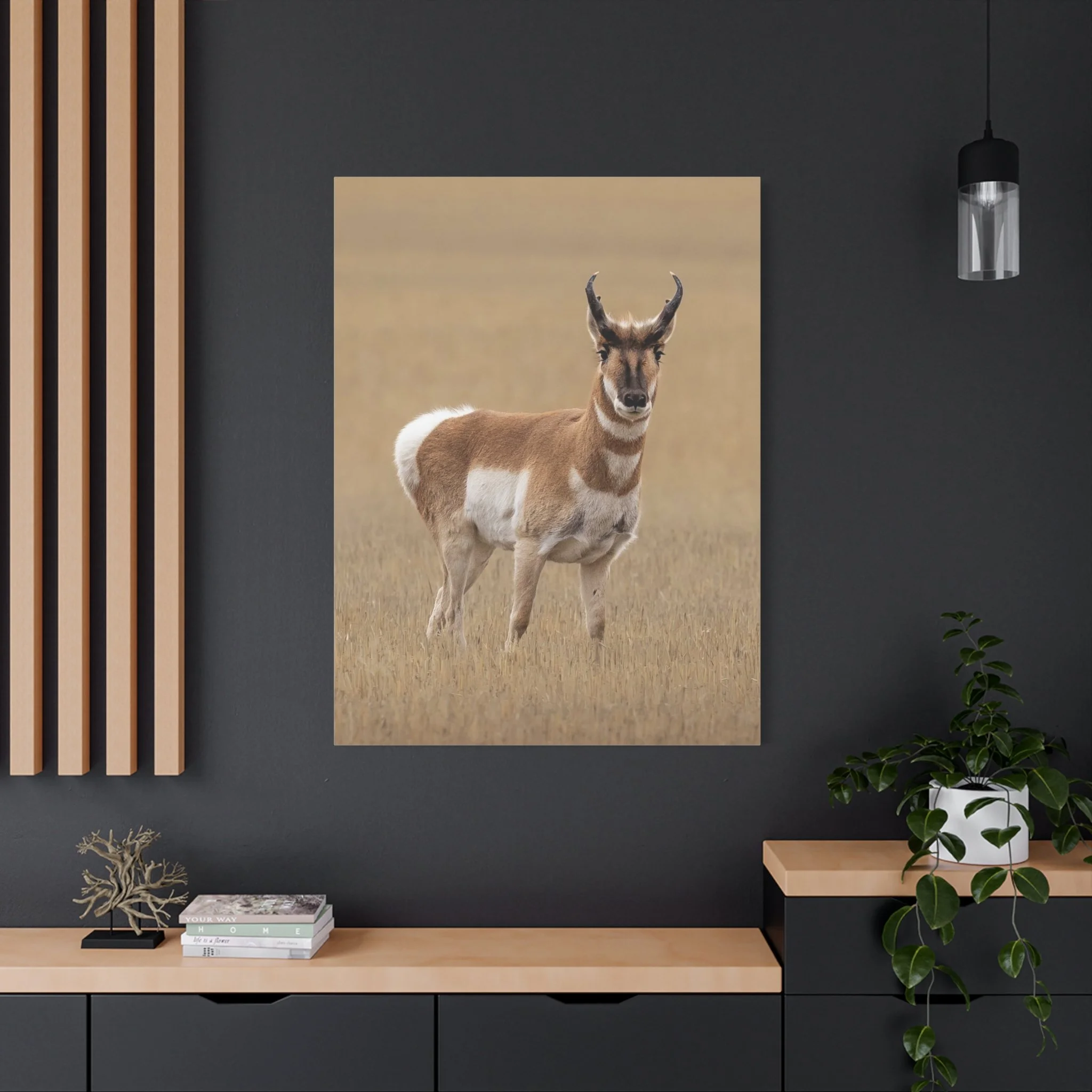 A matte stretched canvas featuring a striking pronghorn portrait that brings quiet, wild energy to your wall. The finely textured cotton-poly surface and premium coating deepen contrast and preserve subtle fur tones, so the pronghorn’s alert gaze and delicate markings read clearly from across the room. Lightweight but sturdy, the slim 1.25" profile sits close to the wall for a gallery-ready look. The soft rubber dots on the back keep the piece steady, and the included hanging hardware makes installation straightforward. This print suits someone who loves open landscapes, wildlife photography, and rooms that sing with natural calm — whether it anchors a cabin living room, a study, or a nature-themed gallery wall.